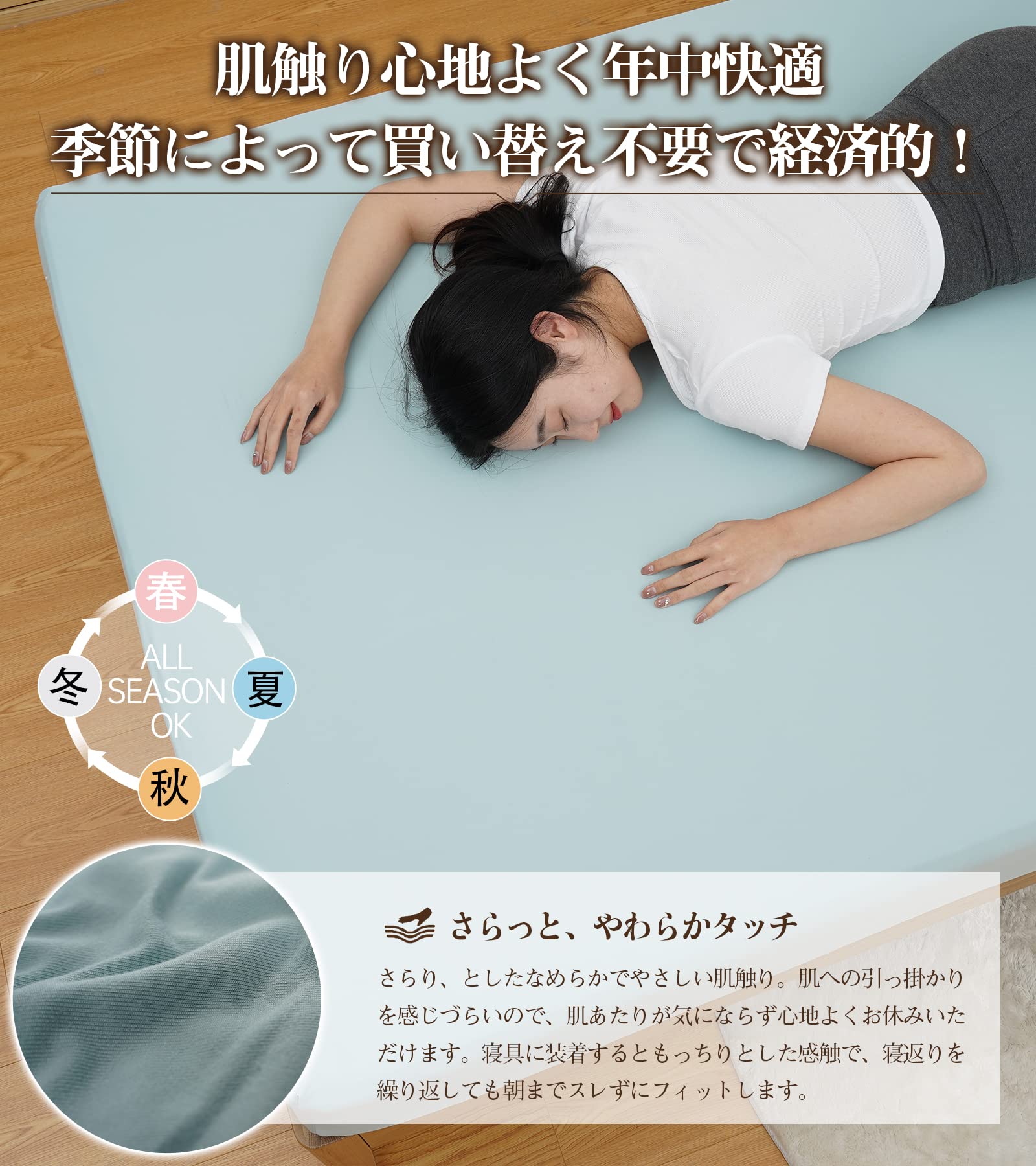 【超柔らかいTシャツ素材&オールシーズン快適】ボックスシーツの生地はまるでおTシャツのようで柔らかくなめらかな肌触りで心地よく、最初から肌になじむように仕上げました。肌への引っ掛かりを感じづらいので、肌あたりが気にならず心地よくお休みいただけます。暖かい季節( 春 夏 )も、寒い季節( 秋 冬 )も 14年を通して長い期間、快適にお使い頂けます。