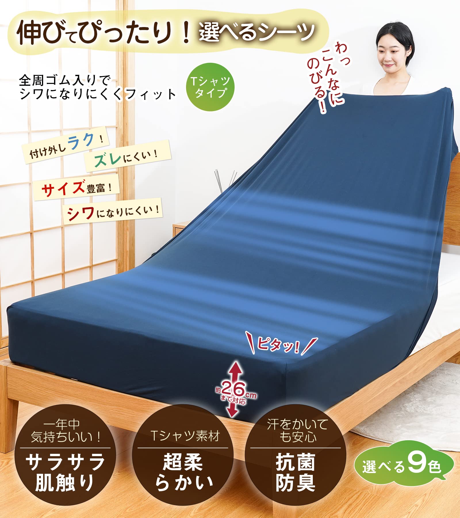 【超柔らかいTシャツ素材&オールシーズン快適】ボックスシーツの生地はまるでおTシャツのようで柔らかくなめらかな肌触りで心地よく、最初から肌になじむように仕上げました。肌への引っ掛かりを感じづらいので、肌あたりが気にならず心地よくお休みいただけます。暖かい季節( 春 夏 )も、寒い季節( 秋 冬 )も 16年を通して長い期間、快適にお使い頂けます。