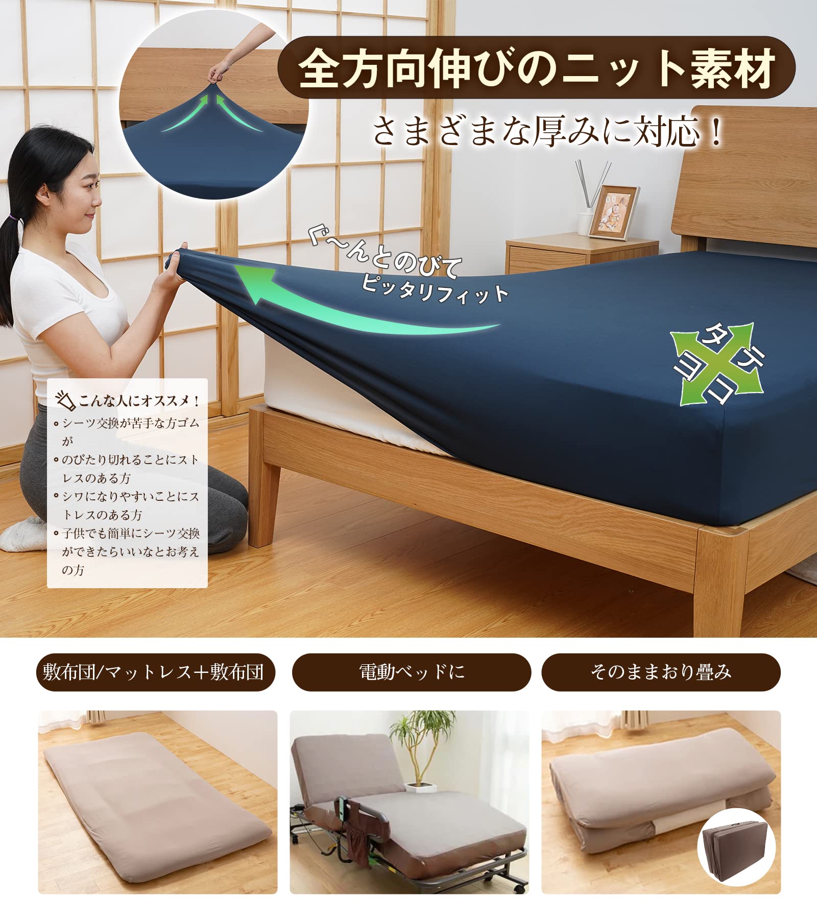 【伸びるストレッチ素材&敷き布団にも使える】ボックスシーツ セミダブル(120x200cm)~ダブル(140x200cm)(ベッドシーツ)は全周ゴム使用で伸縮するから 敷布団にもぴったりフィット。三つ折りマットレスもそのまま折り畳む事もできて手間を省けます。