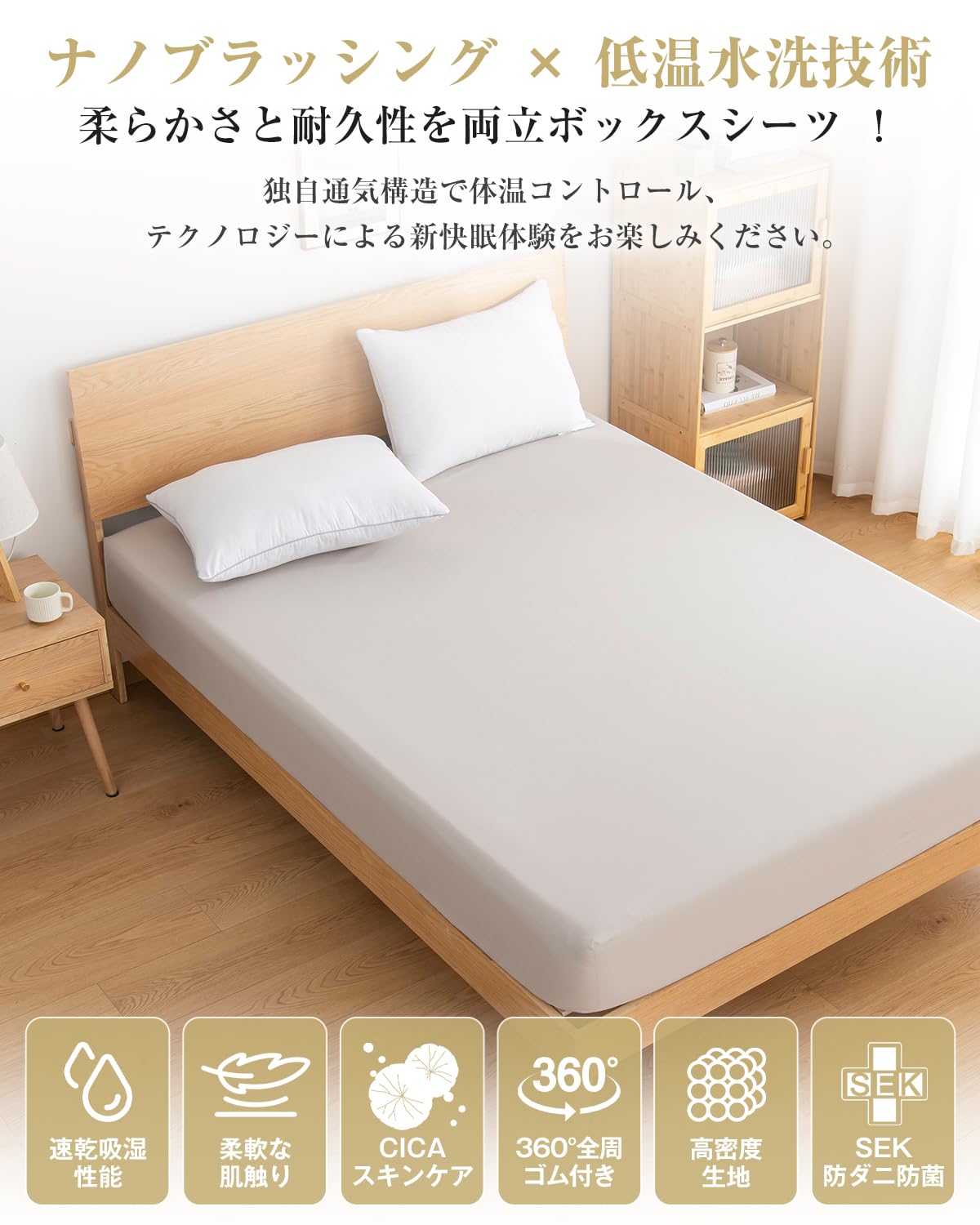 【微細ナノブラッシング × 温和低温水洗技術で一年中快適な高品質ボックスシーツ!】「微細ナノブラッシング」と「温和低温水洗技術」を搭載したこのボックスシーツが、あなたのくつろぎの時間を革新します。微細ナノブラッシング技術は、ボックスシーツの織り目の奥まで入り込み、寝汗や皮脂、ホコリをしっかり除去。目に見えない汚れだけでなく、睡眠を妨げる細菌まで徹底的に取り除き、清潔感を保ちます。そして、温和な低温水洗技術がボックスシーツ本来の柔らかさを守ります。通常の洗濯で心配される色褪せや生地が硬くなることもなく、繊維を傷つけずに洗浄。厚手のフェルト素材やシルキーなパイル生地も、繰り返し洗ってもふわふわな触り心地を維持します。当社が追求した「ナノ × 低温」のハイブリッド技術は、快適な睡眠環境と製品の長持ちを両立させました。季節を問わず、ボックスシーツ特有のサラサラ感と暖かみを損なうことなく、毎朝を爽やかにスタートさせるための新時代の洗浄技術をぜひご体験ください!