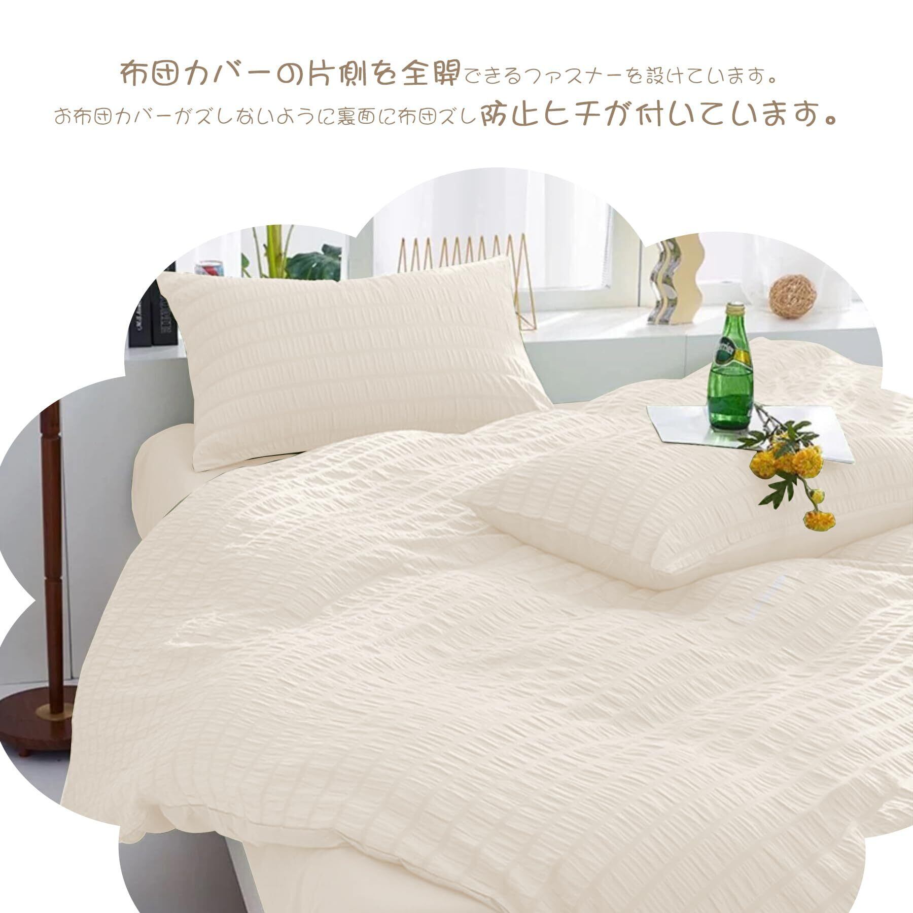 布団カバー 【シアサッカー生地 ホスール(HOSUR) 】 寝具カバーセット ピーチスキン加工 掛け布団カバー ボックスシーツ 枕カバー 優しい肌触り柔らかい 速乾タイプ 洗い替え(クリーム色,セミダブル・4点セット)