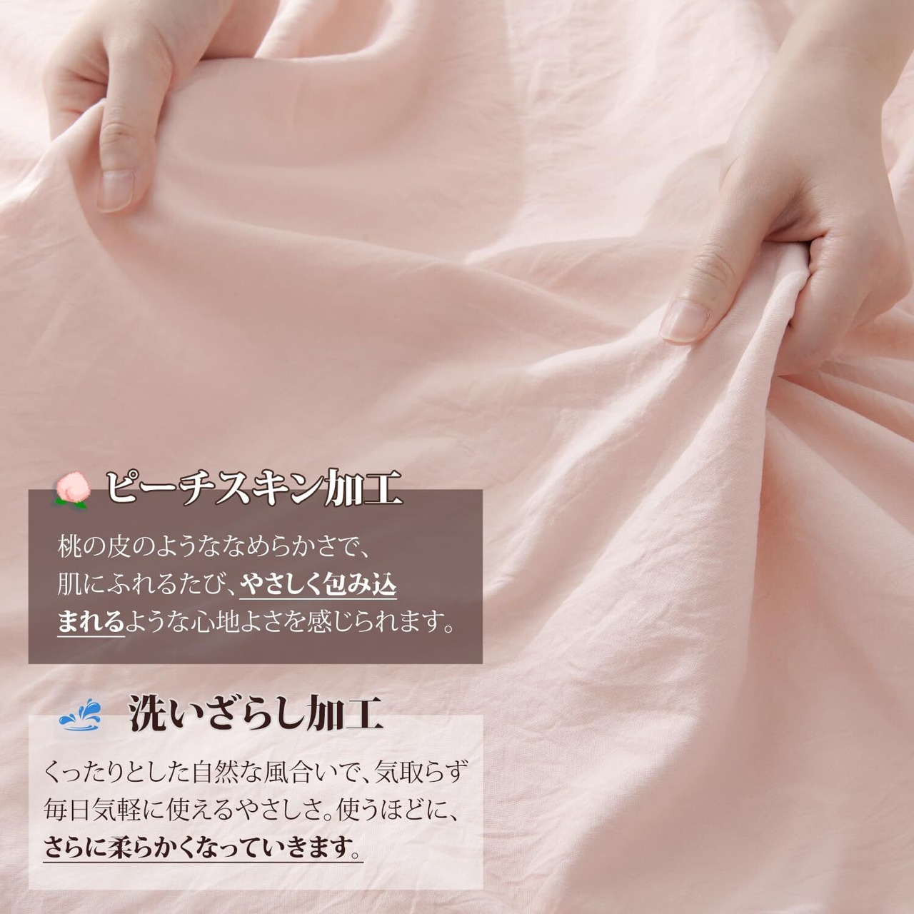 「洗いざらし+ピーチスキン加工」洗いざらし仕上げにより、使い始めからやわらかな風合いを楽しめます。さらに、表面には桃の皮のような微細な起毛(ピーチスキン加工)を施し、ポリエステル素材でありながら天然繊維のようななめらかな肌触りを実現しました。毛玉やほつれができにくく、長く愛用いただけます。