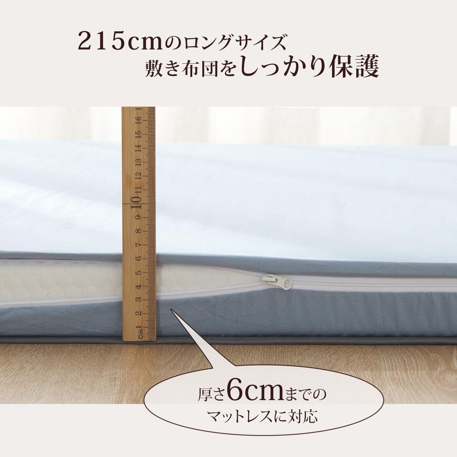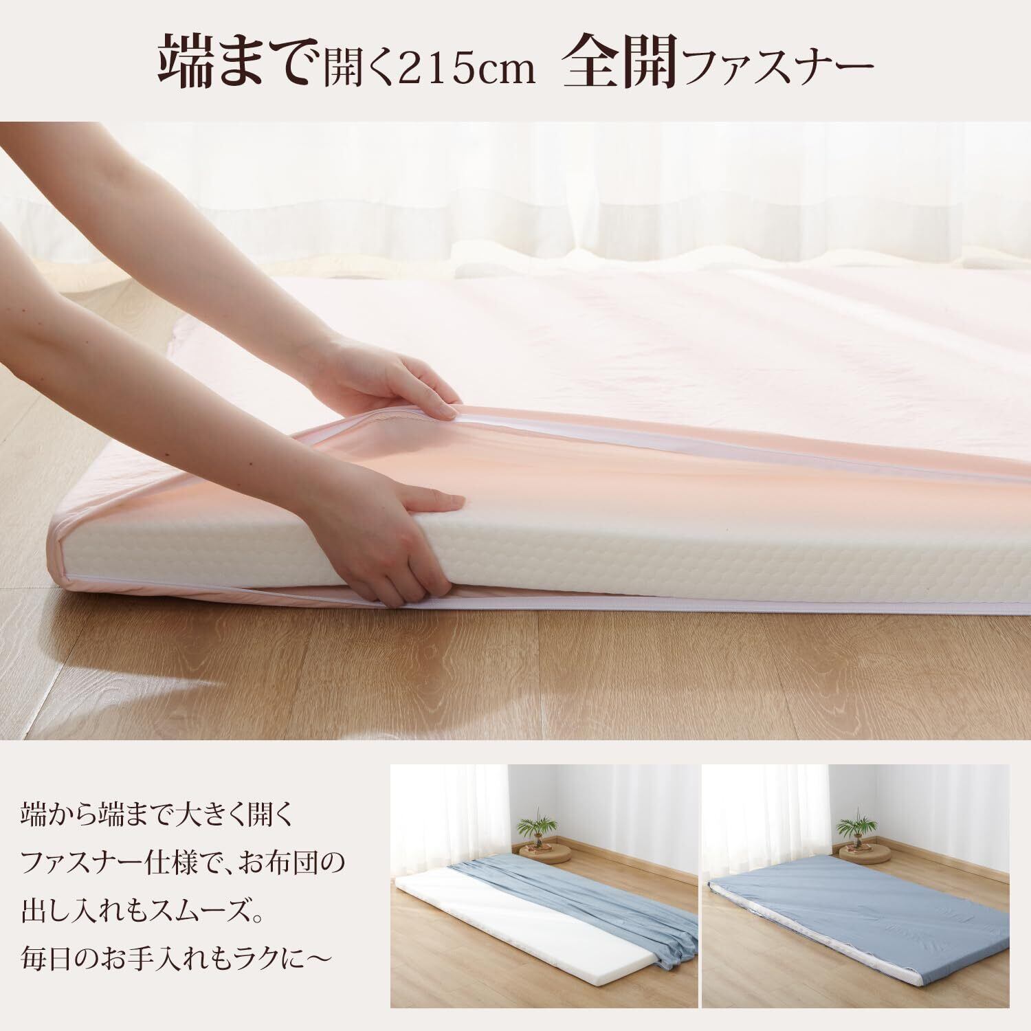 「お手入れ簡単なデザイン」片側に215cmの全開ファスナーを採用しており、敷き布団の出し入れがスムーズにできます。敷き布団全体をすっぽり包み込むデザインで、本体を汚れから守り、カバーを洗うだけで清潔を保つことができます。