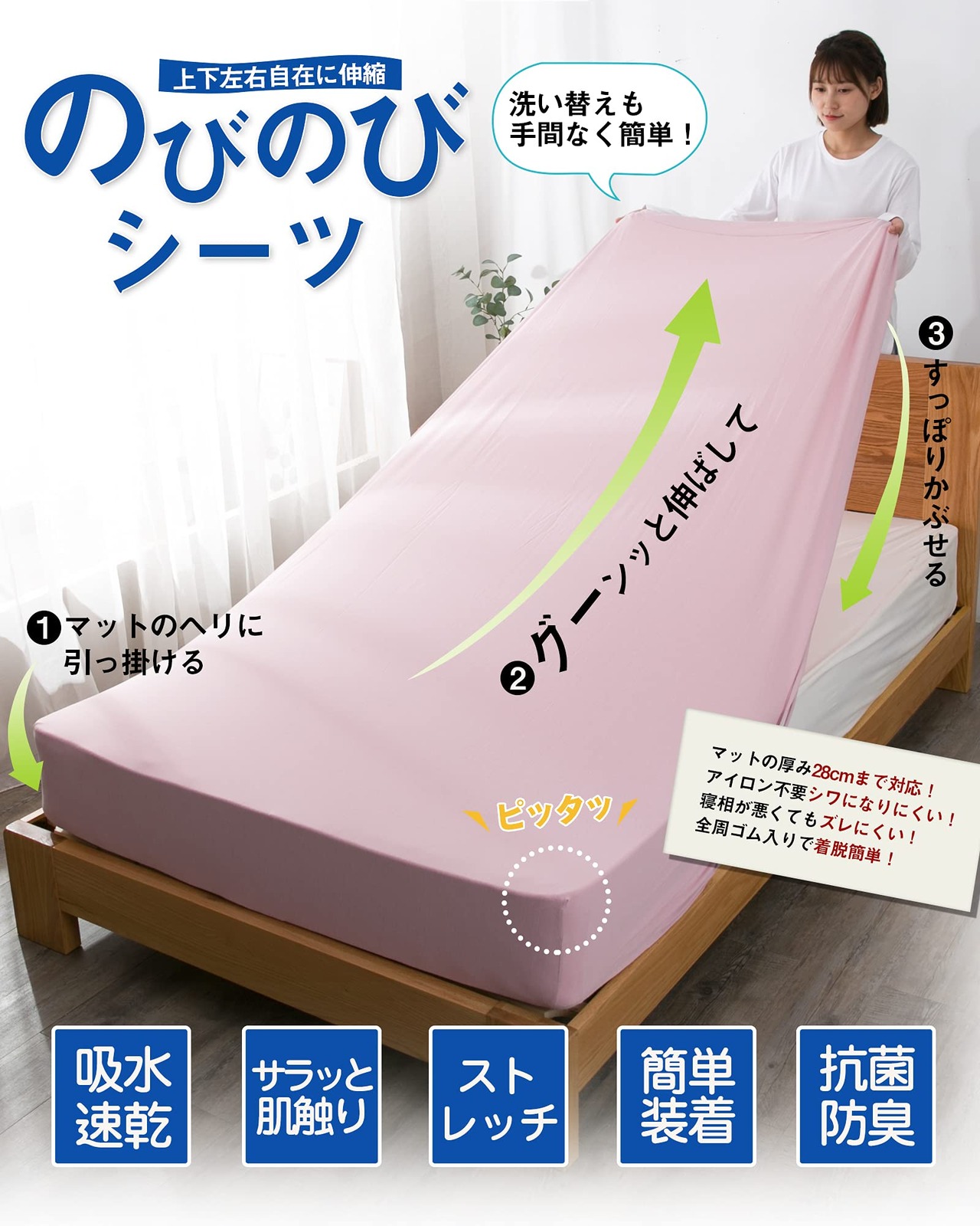 【ストレッチ性&付け外し簡単】❶伸縮性に優れタテにもヨコにも伸びるストレッチ素材だから、手間をかけず簡単に装着可能。❷シワになりにくく、アイロンいらずでキレイにフィットするBOXシーツです。❸いろいろなサイズのマットレス、敷ふとんや三つおりタイプのマットレスなどにもぴったりフィットのボックスシーツです。そのまま折りたたみ可能!面倒家事も短縮できます。
