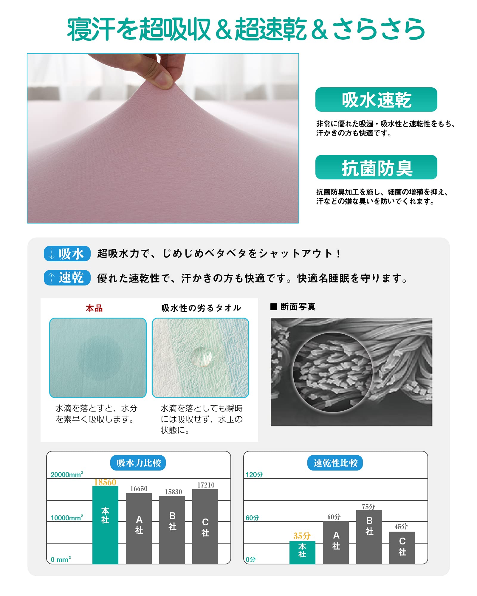 【超吸水速乾】:優れた吸湿性と通気性で、汗でもベタつかないサラサラ感を保ちます。ムレにくく、1年中快適にお休みいただけます。汚れ防止だけでなく、肌への優しさ、快眠のために機能する快眠シーツです。【ご自宅で丸洗い可能】:洗濯耐久性に自信あり!ご自宅の洗濯機で丸洗い可能、いつでも清潔に使えます。洗い替え用2枚以上のご購入をお勧めします。