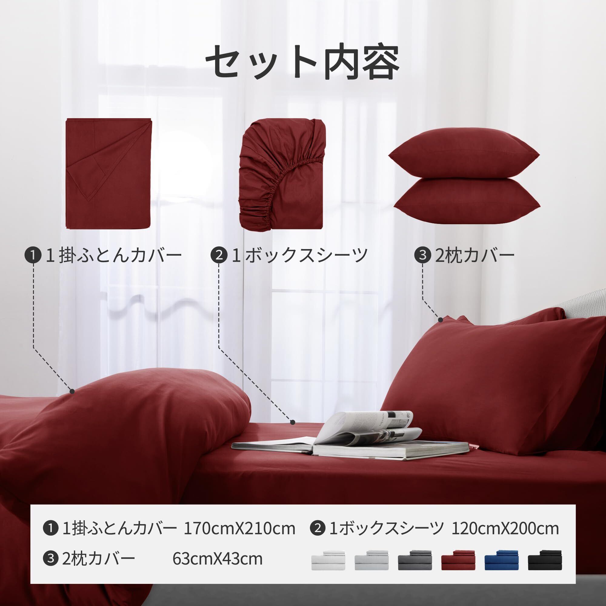 【商品仕様】素材:ポリエステル100%。その素材にはやわらかいです。環境に優しい素材は肌に優しく、寝心地が非常にいいです。セット内容:掛け布団カバー(1枚):170X210cm(セミダブル);ボックスシーツ(1枚): 120X200X30cm;高さ3-28cmの敷き布団とマットレスに対応できます。枕カバー(2枚): 封筒式(43x63cm)。シンプルで無地な設計を採用しており、お部屋を広く明るく見せ、高級感が溢れています。