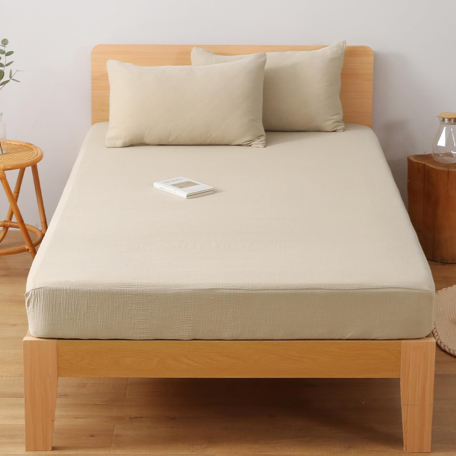 【特価セール】SE ボックスシーツ ダブル 綿100% ガーゼ ベッドシーツ マットレス/ベッド/敷き布団カバー 柔らかい 吸湿通気 抗菌·防ダニ 全周ゴム付き ずれない 洗える オールシーズン (140X200cm・カーキ) 「SE Softexly」 | asaRulu0511