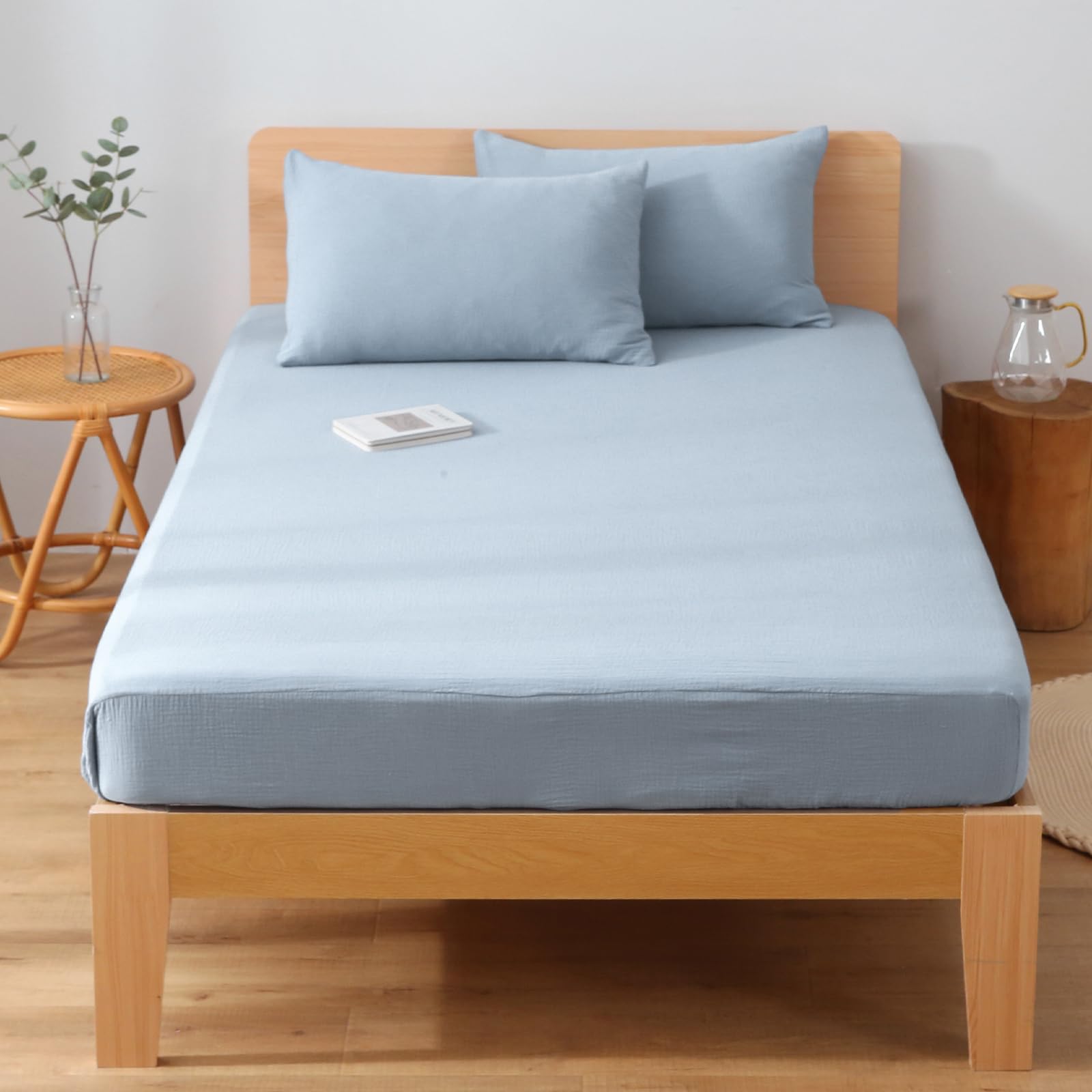 【特価商品】SE ボックスシーツ ダブル 綿100% ガーゼ ベッドシーツ マットレス/ベッド/敷き布団カバー 柔らかい 吸湿通気 抗菌·防ダニ 全周ゴム付き ずれない 洗える オールシーズン (140X200cm・ブルー) 「SE Softexly」 | asaRulu0511