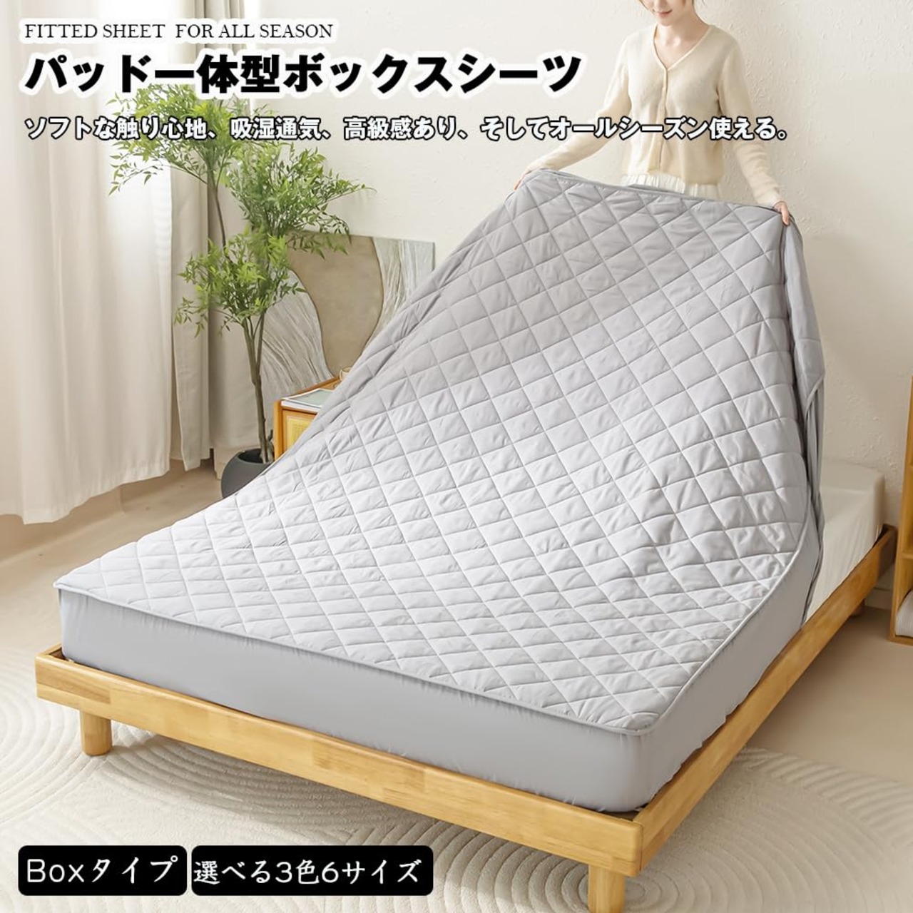 <ボックスシーツ一体型パッド>ボックスシーツタイプは四隅ゴムバンド式よりしっかりマットレスを包んでくれます。着脱も簡単で、繰り返し寝返りをしてもズレる心配が要らないです。