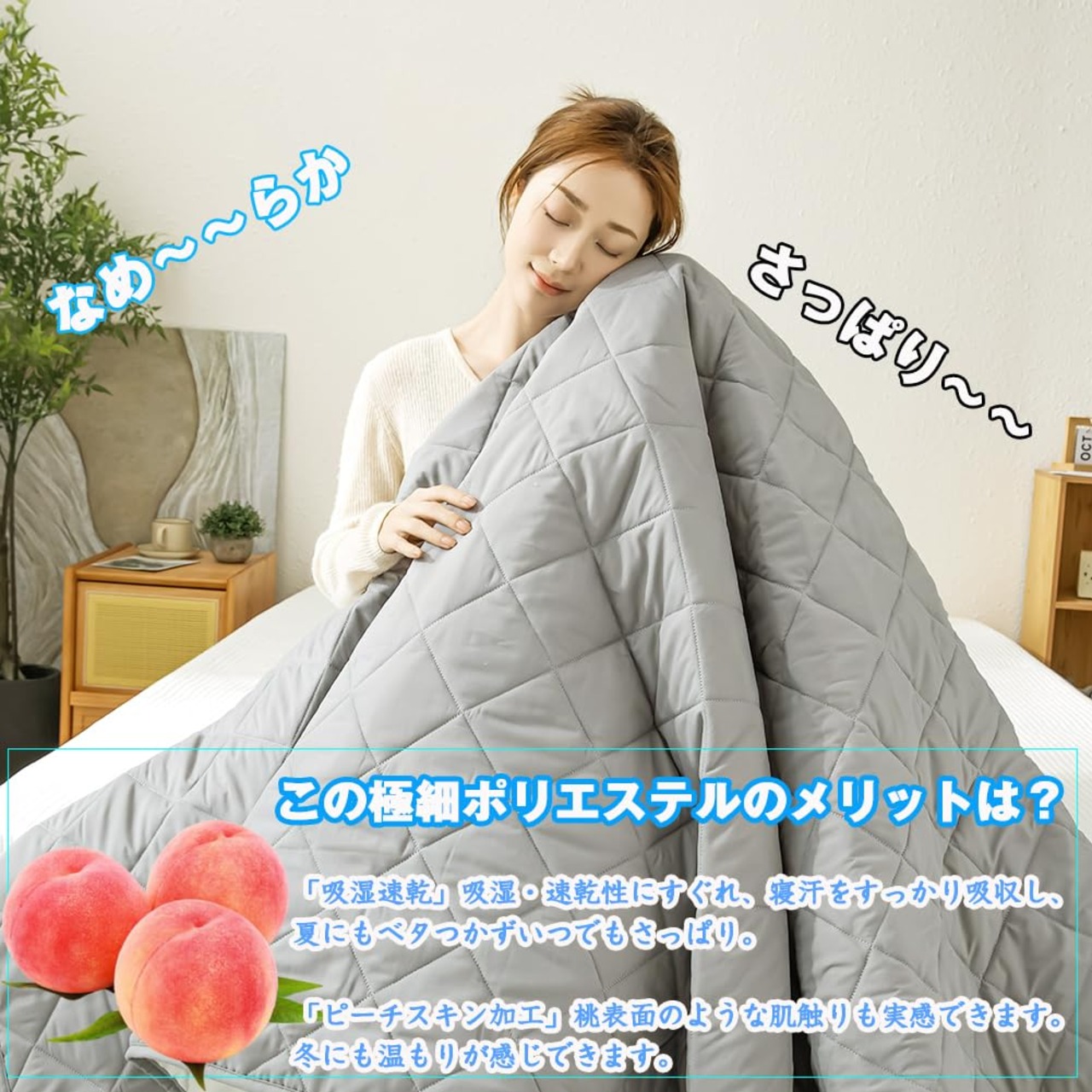 <吸湿通気>側生地は100%の極細ポリエステルですから、柔らかい触り心地が毎日実感いただけます。この素材は優れた吸湿通気も兼備しているので、寝汗をしっかり吸収し、夏にも蒸れなく快適に利用いただけます。