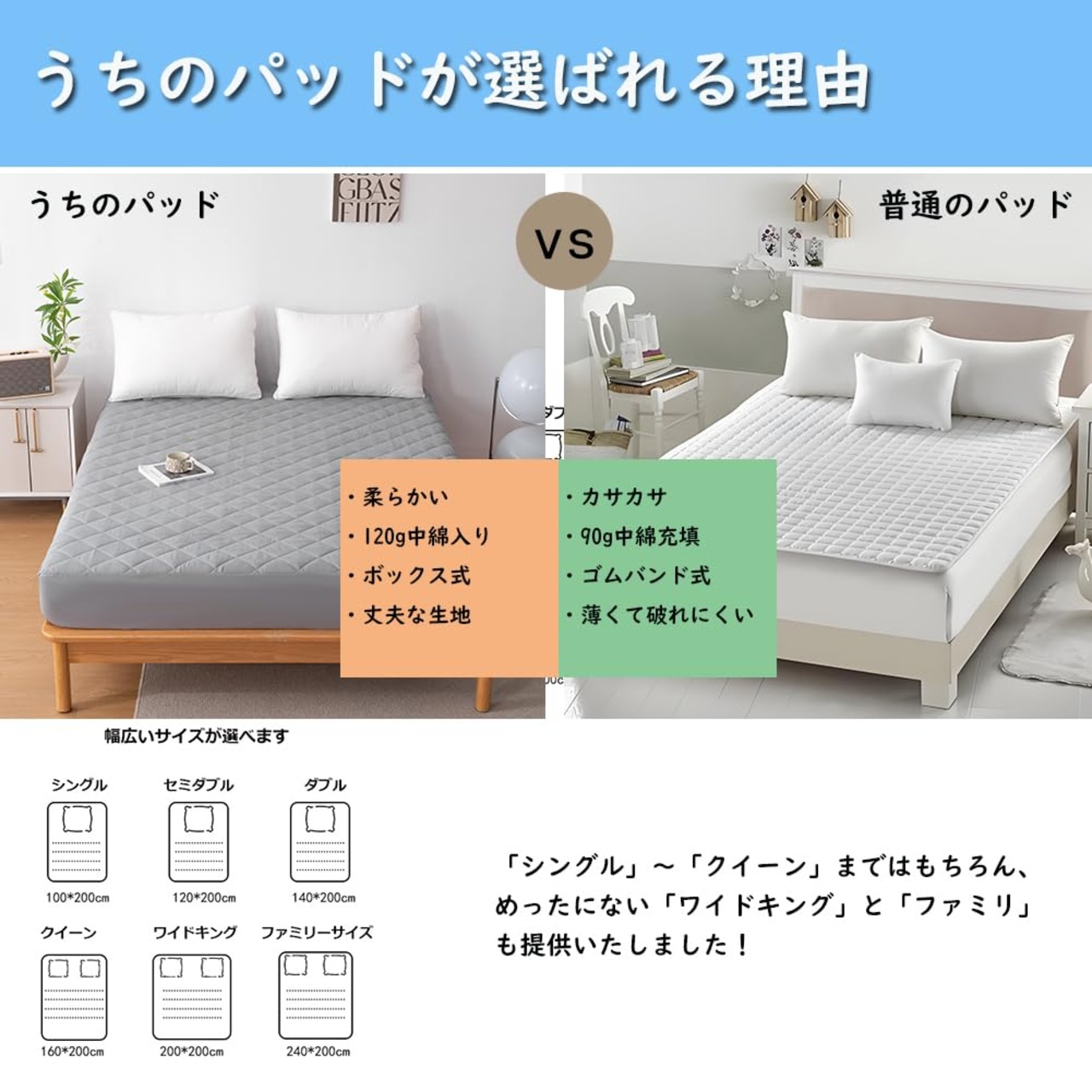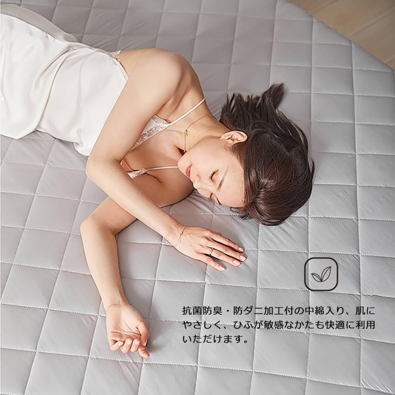 <1.5倍中綿充填>普通のパッドの1.5倍中綿入れ、もっとクッション性が実現しました。中綿が防ダニ・防臭加工付き、皮膚が敏感な方も快適に利用いただけます。