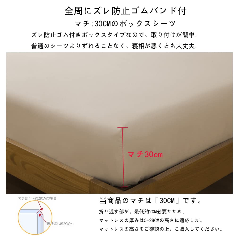 【極柔な肌触りピーチスキン加工】高密度織りの生地を厳選し、丁寧な作りで厚みのあるボックスシーツです。耐久性が高い、長くご使用いただけます。ピーチスキン加工で、すごく柔らかく、シワや毛玉もなりにくく、サラサラとした肌触りですごく心地よいです。毎日快適に眠れて、一年中お使いいただけます。