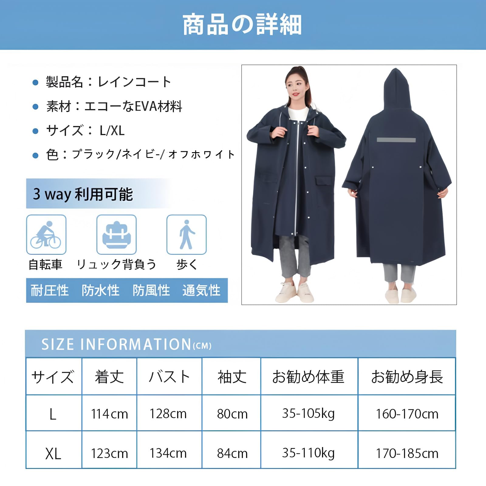 [Yunicko] レインコート 自転車 通学 通勤 ポンチョ レインポンチョ レインギア レインウェア レインジャケット リュック対応 マジックレインコート 二重つば付き 反射テープ アウトドア キャンプ 防災 バイク 野外フェスレインコート 安全ロング丈 クリア視野 超軽量 防塵 防雪 防汚 防風(ネイビーL)