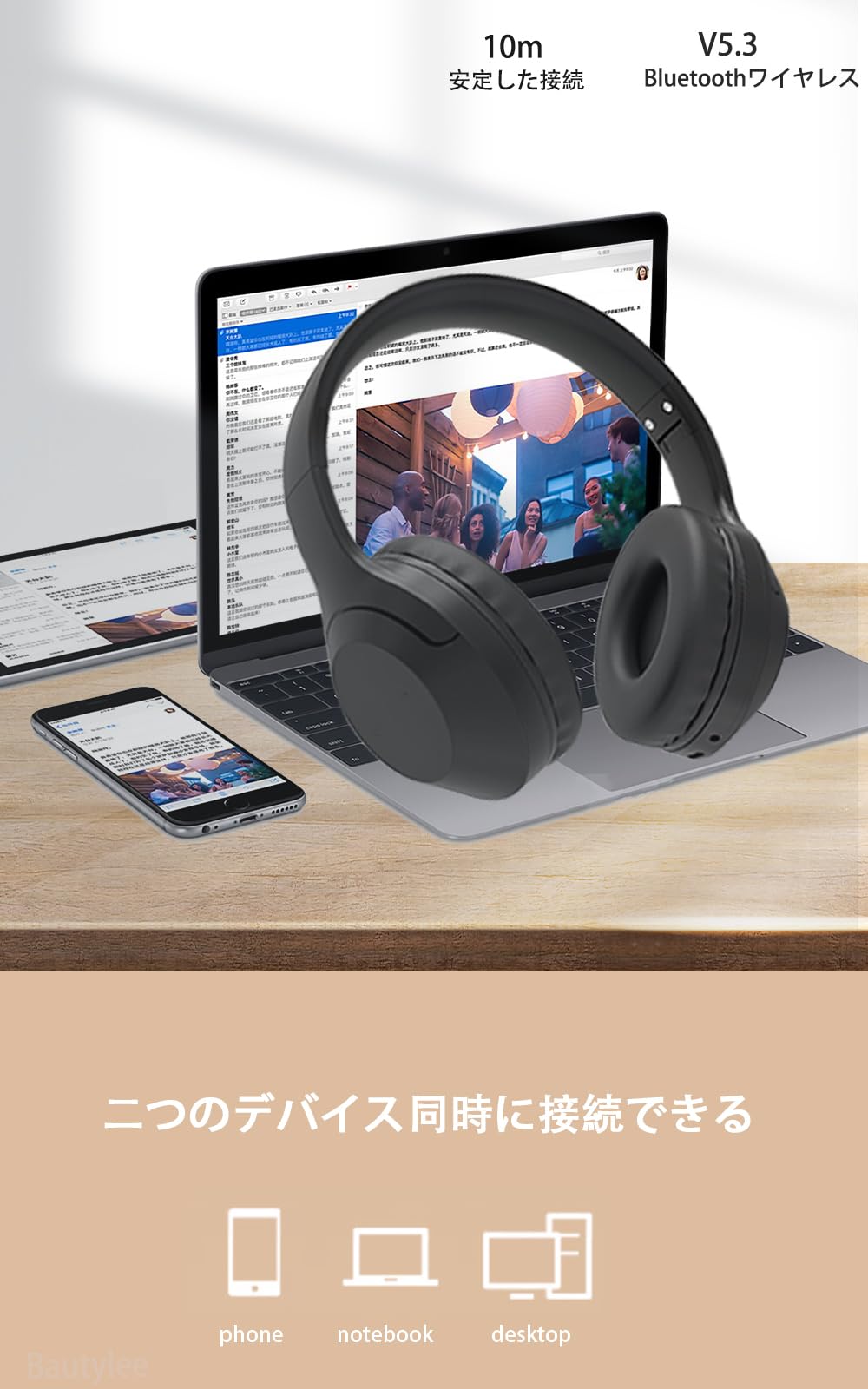 【新着商品】Bautylee ワイヤレスヘッドホン Bluetooth 5.3 オーバーイヤーヘッドホン/HiFi ステレオ重低音/遅延なし/密閉型/軽量/折り畳み可能/内蔵マイク付き/無線 3.5mm AUX有線両用/最大46時間連続再生/日本語取扱説明書付属(ブラック)