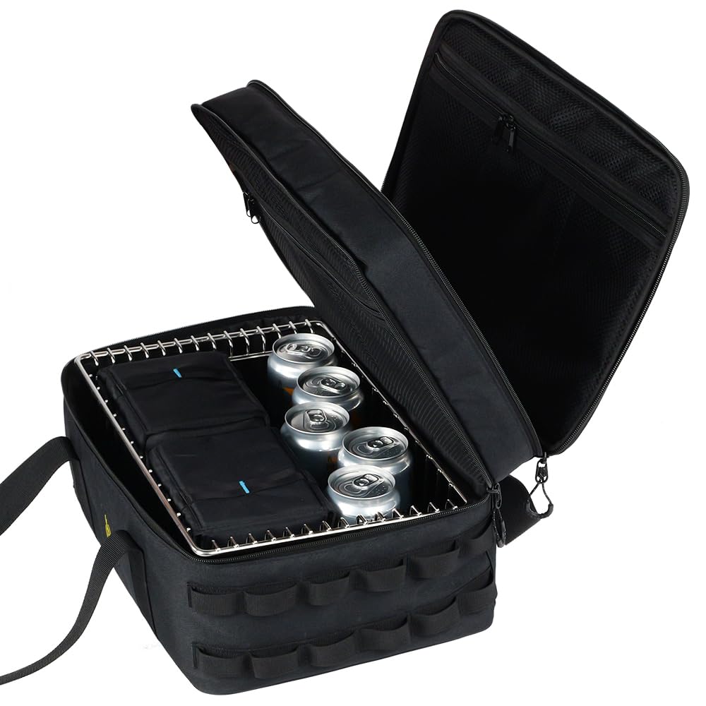 収納力抜群:大容量で、また、複数の収納ベルト、メッシュポケットや小物入れポケットが備わっており、テント、タープ、シェルフ、食器、ガス缶、調味料、ボトルやアクセサリーなど、複数のアイテムをカテゴリ別にまとめて収納することができます。