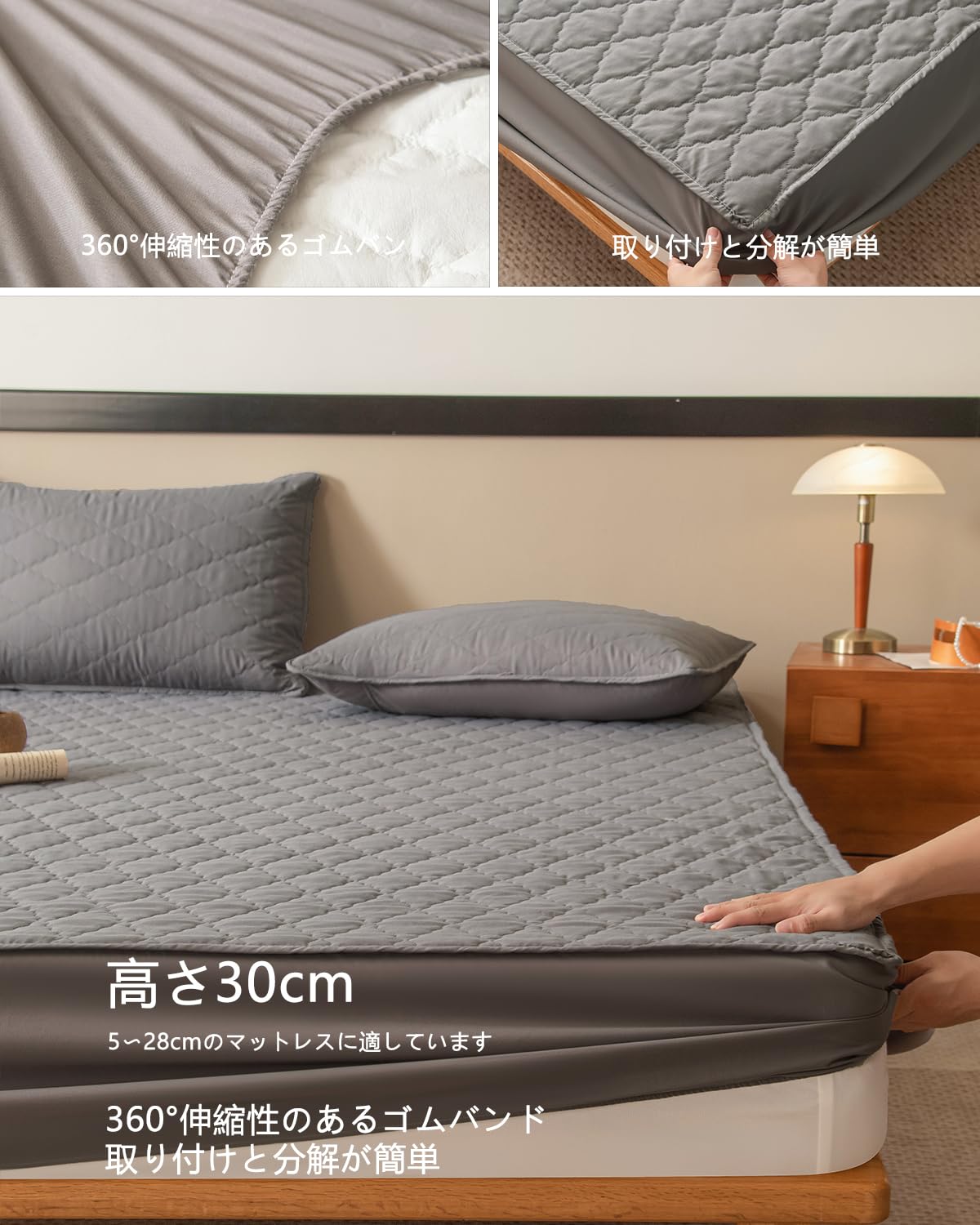 【360°滑り止め】ボックスシーツはゴムバンドで360°カバーし、ズレを防止します。 厚さ5cmから30cmまでのマットレスに対応します。