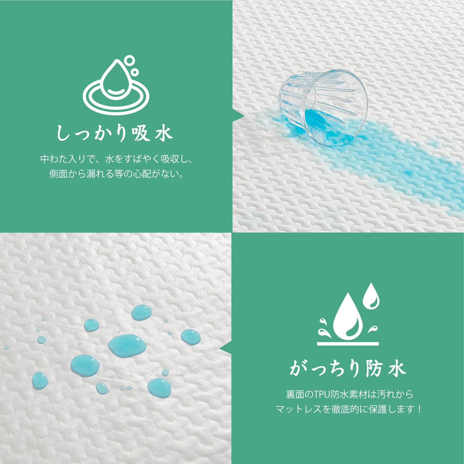 「吸湿・防水」シーツは中ワタ入りで、肌触り柔らかい上に、水分を素早く吸収し、側面やあちこちへ漏れる心配がなくてとても安心!裏面のTPU防水素材は汚れをマットレスから完全にシャットアウトし、いつでも清潔に保ちます。
