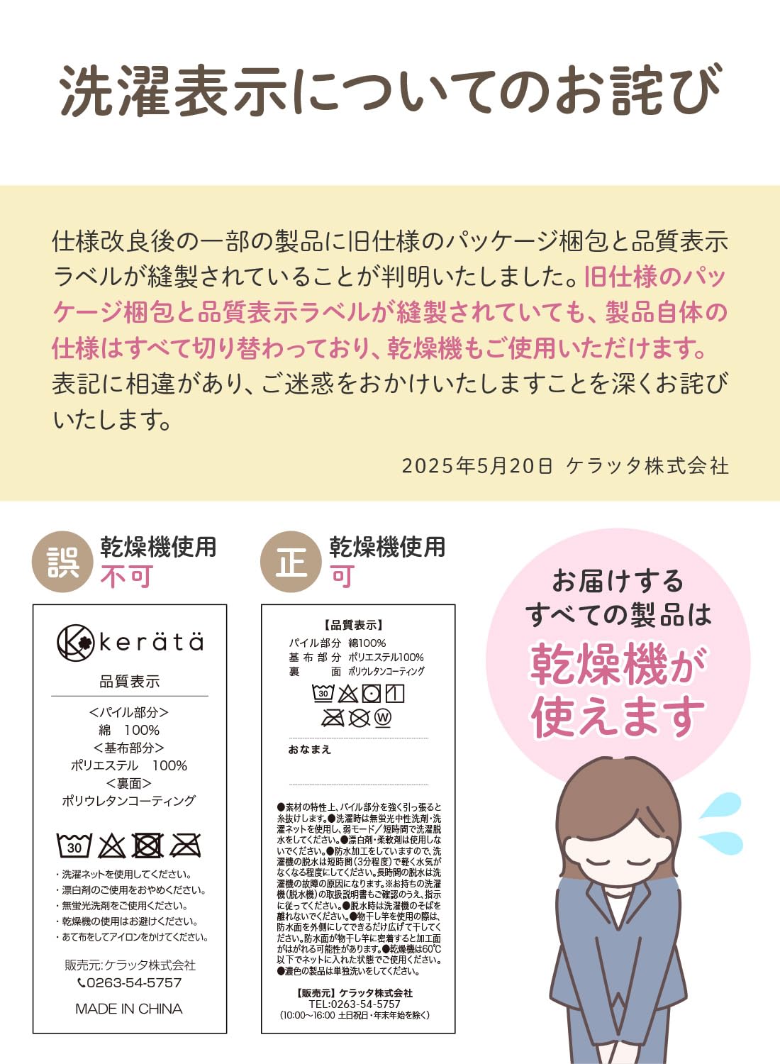 【サイズ】70×120cm【素材】パイル部分:綿100%、基布部分:ポリエステル100%、裏面:ポリウレタンコーティング【品質表示】日本語洗濯表示タグ 洗濯機(洗濯ネット使用)、乾燥機(洗濯ネット使用・乾燥温度上限60℃)【企画・監修】日本【MADE IN CHINA】 ※素材の特性上、パイル部分を強く引っ張ると糸抜けします。※防水シーツ端のテープ巻き縫製部分に水分がかかると縫い目から漏れるおそれがあります。 縫製部分に水分が流れないようご注意ください。※商品仕様は改良のため、生産と在庫状況により記載情報と若干仕様が異なる場合がございます。※閲覧時のモニター環境や光の当たり方などによって、写真と実際の商品の色合いが異なって見える場合がございます。予めご了承ください。
