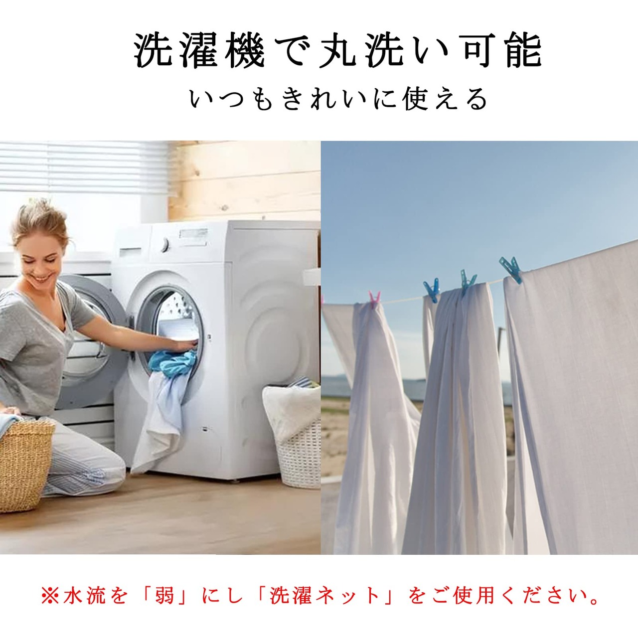お手入れ簡単:ご自宅の洗濯機で丸洗い、繰り返し洗濯をしても可能。いつでも清潔に使えます。水流を「弱」にし「洗濯ネット」をご使用ください。