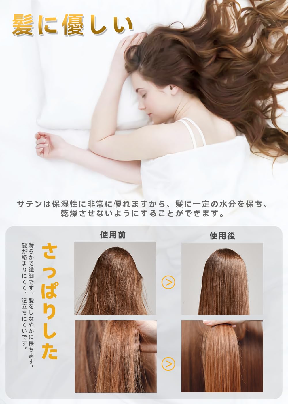 【柔らかくて良い通気性】サテンの柔らかさは純綿よりも優れており、純綿の表面粗さ係数は3.46、サテンの表面粗さ係数は0.628しかないため、肌に触れても違和感がありません。女性にとって、生地の柔らかさに対する要求がもっと高いですので、本両面サテンが良い選択です。サテンは多孔性繊維の一種であり、吸湿性と放湿性と通気性にも優れています。純粋な綿と比較して、サテンの枕カバーがもっと良い選択です。