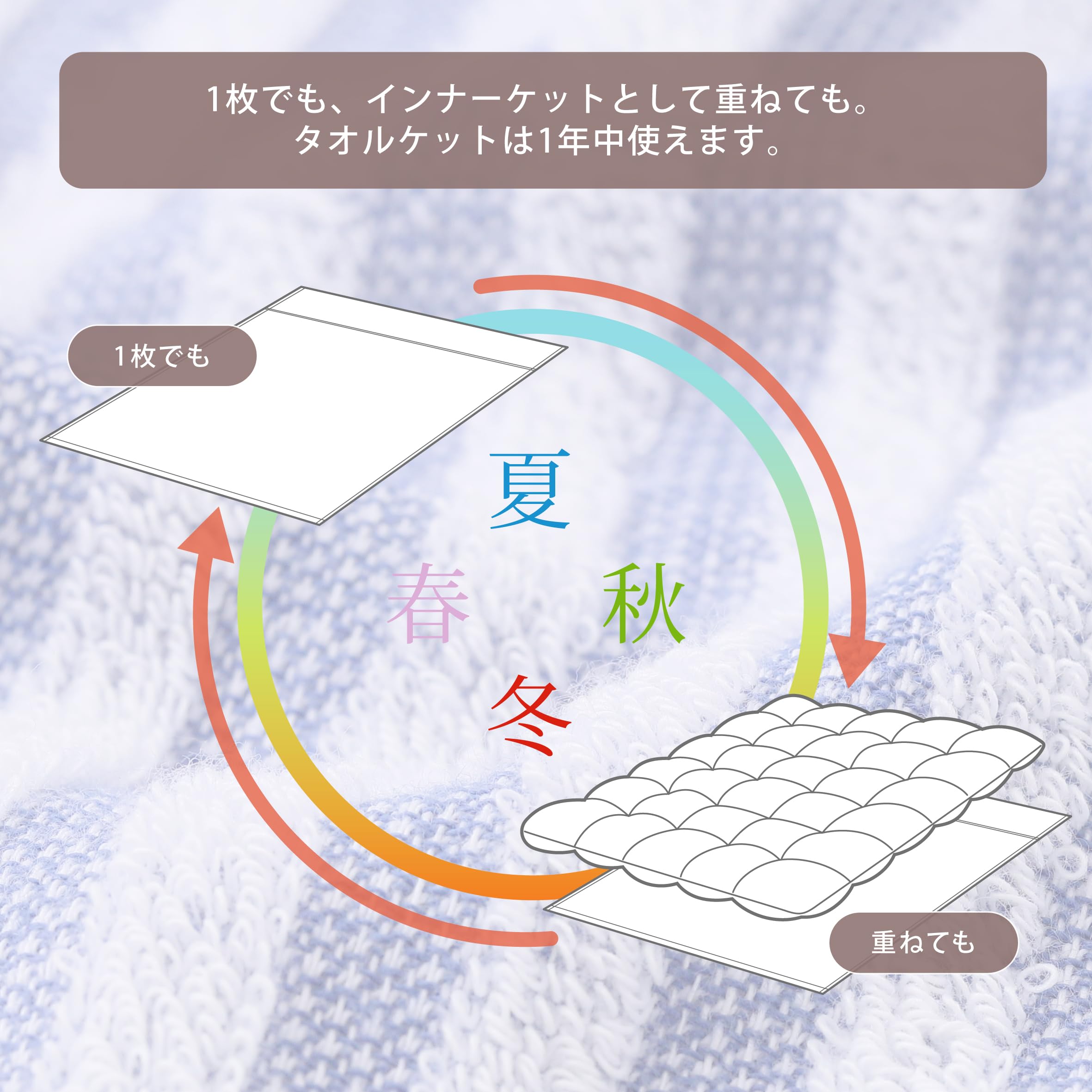 ◆ふんわり柔らかな肌触りのタオルケットは、暑い季節は1枚で、秋冬は布団と合わせてインナーケットとしてもお使いいただけるので、オールシーズン活躍します。
