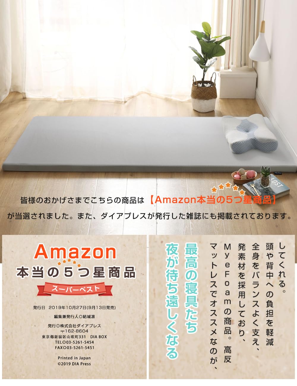 【腰の悩みから解放】MyeFoamの高反発マットレスは優れた反発力(180N 高反発)が特徴で、腰の沈み込みを防ぐ。腰回りも下から持ち上げるように支えて心地良い寝姿勢をキープしてくれます。反発力のある硬めの寝心地で体をしっかり支える、寝返りが打ちやすく就寝時の腰にかかる圧力もかかりません。適度な硬さ&優れた反発力だから、今までのマットレスで背中や腰が沈んでしまって寝にくいといった経験がある方にもおすすめです。皆様のおかげさまでこちらの商品は【Amazon本当の5つ星商品】が当選されました。また、ダイアプレスが発行した雑誌にも掲載されております。