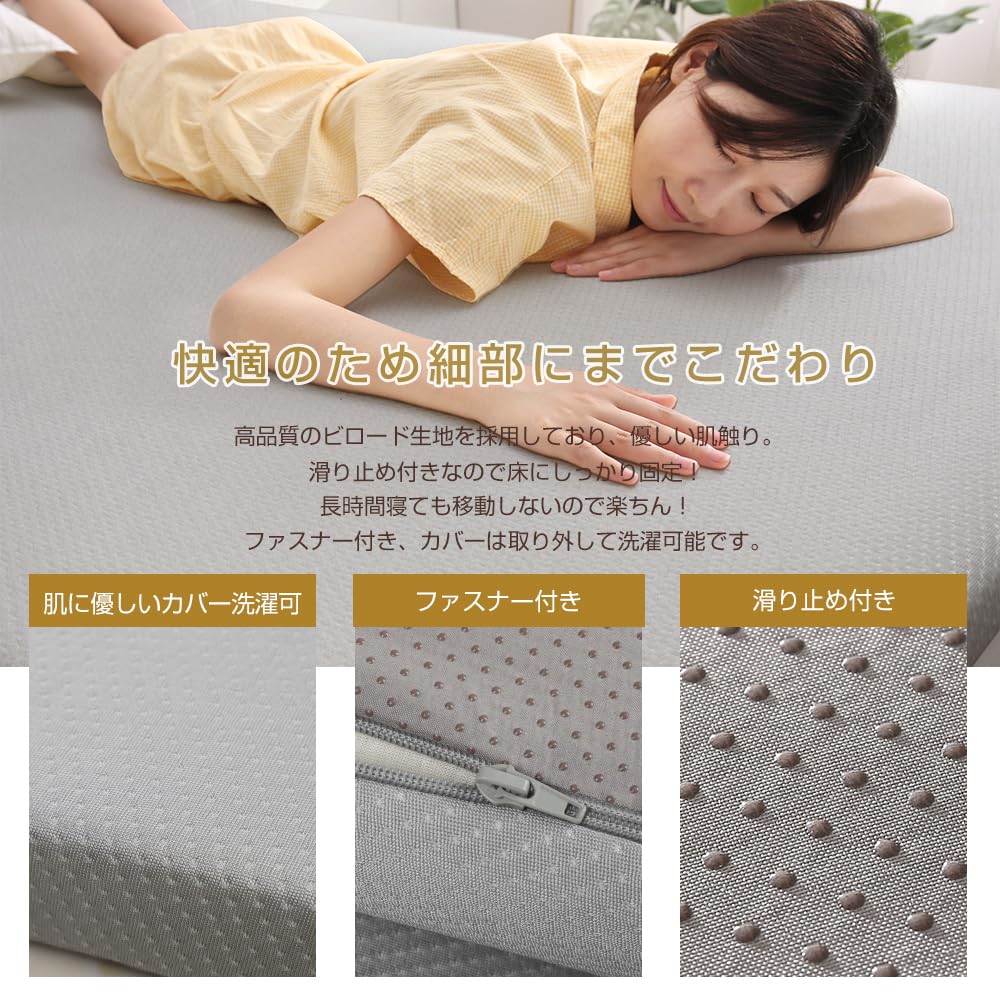 【お手入れ方法について】側生地が汚れた場合は、上から薄めた中性洗剤を浸した布等で叩くように汚れをとってください。 ※カバーが付属しており、洗濯できます。寝具を大きく変えた場合は、寝れない寝具のため体の初期反応として、場合により「体が痛い・寝心地が悪い・腰が痛る」などが発生する場合がございます。その場合、数日連続的にお使ってみればだんだん慣れていきます。アフターサービスのことはご心配しないでください。
