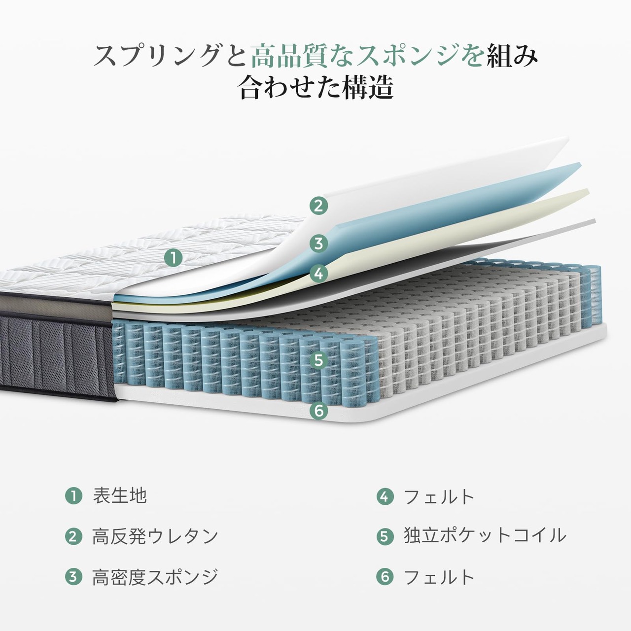 【やや硬めの高反発ポケットコイルマットレス登場!】 高密度ポケットコイルが、高反発の特性を備えて、身体全体をしっかりと支えます。やや硬めの設計により、寝返りがスムーズで、身体の沈み込みを防ぎ、腰や背中への負担を軽減し、理想的な寝姿勢をサポート。