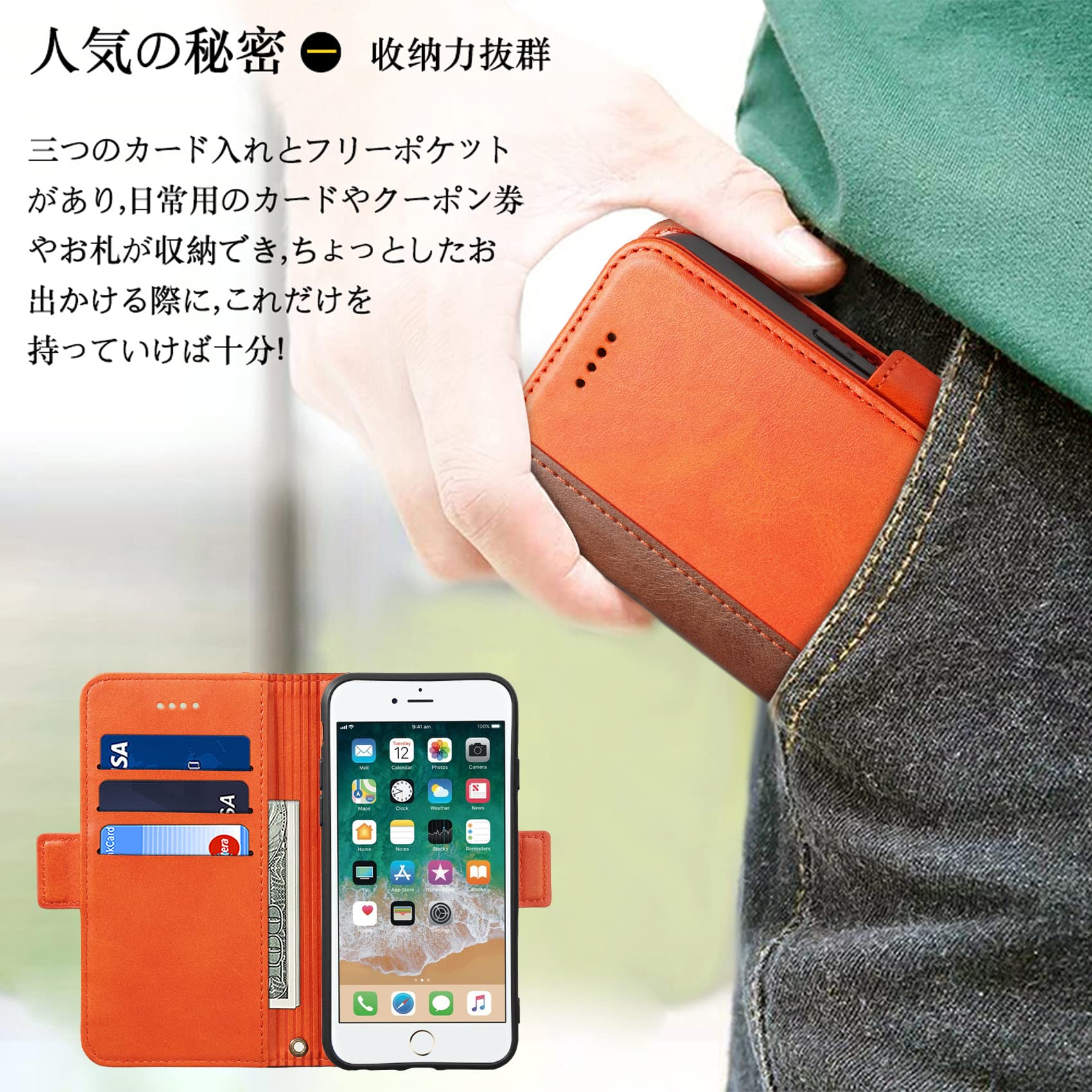機能性 横置きスタンド機能が付いて、好きな角度で動画鑑賞や読書などを楽しめます。ブック型ケースとして、内側には三つのカード入れとフリーポケットがつき、名刺や定期券の収納に優れているiPhone se 第3世代 手帳型ケースです。