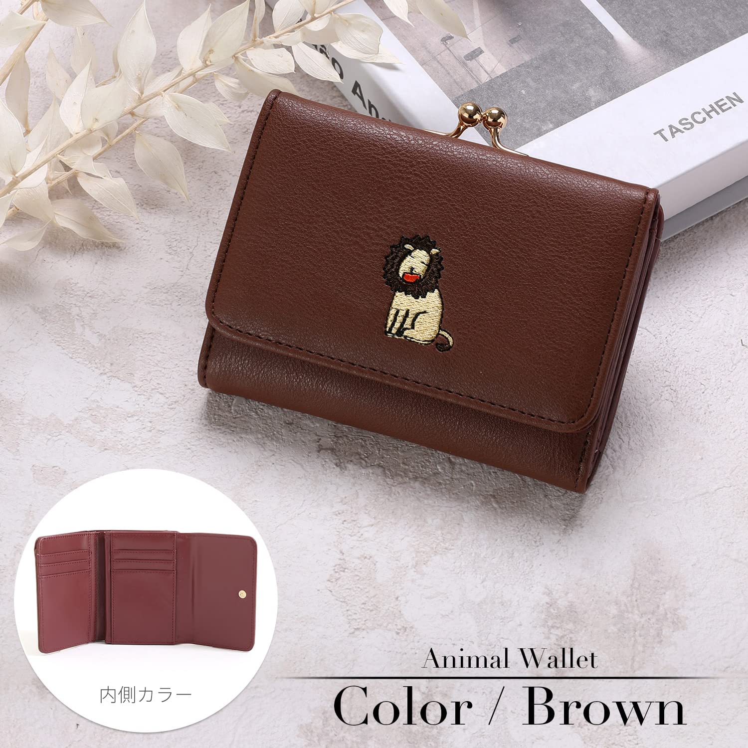 NARU(ナル) アニマル刺繍 がま口 三つ折り 財布 ミニ財布 レディース コンパクト 小さい 小銭入れ カードケース 動物 おしゃれ 人気 ブランド ブラウン (ライオン)