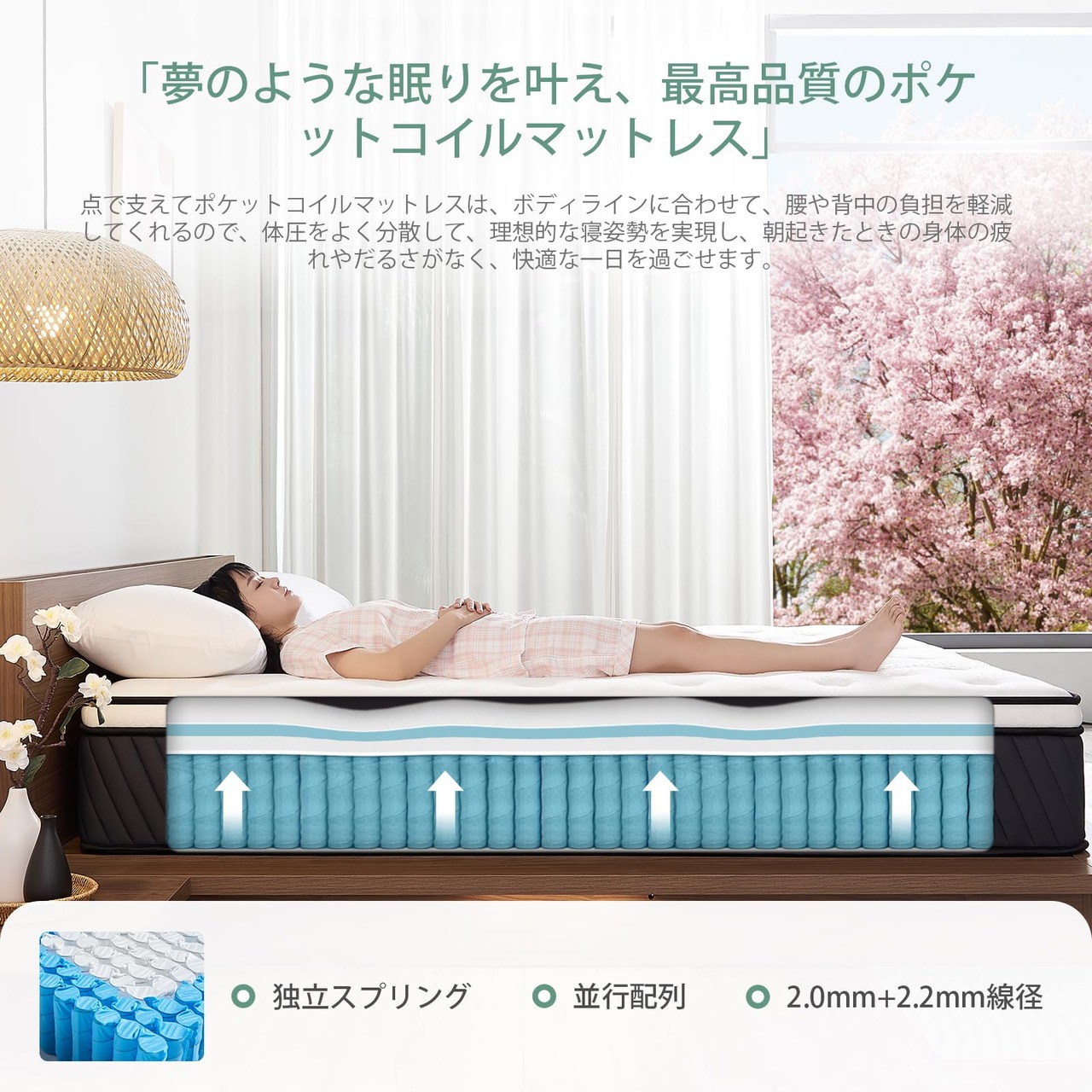 【長持ちポケットコイル】ポケットコイルマットレスは、線径2.0mm/2.2mmのポケットスプリングを採用し、スプリングの老化を防ぎ長持ちさせます。 独立したポケットスプリングは、体にかかる力をよりバランスよくすることができ、体の圧迫感を和らげ、快眠をもたらすことができます。
