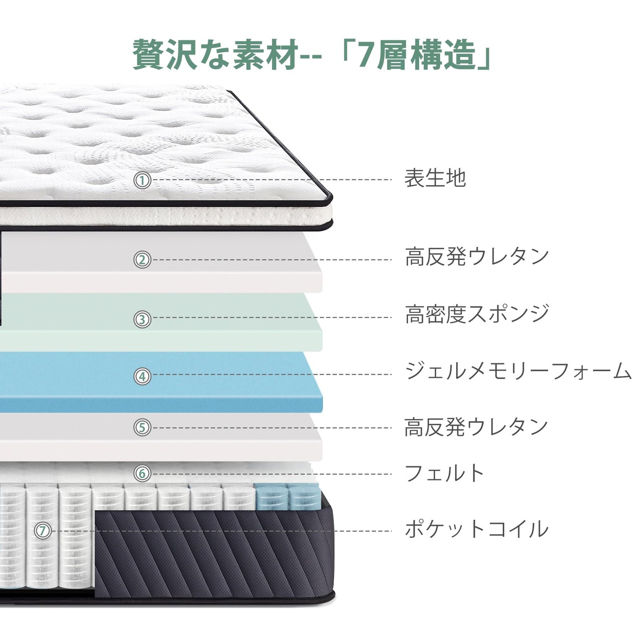 【長持ちポケットコイル】ポケットコイルマットレスは、線径2.0mm/2.2mmのポケットスプリングを採用し、スプリングの老化を防ぎ長持ちさせます。 独立したポケットスプリングは、体にかかる力をよりバランスよくすることができ、体の圧迫感を和らげ、快眠をもたらすことができます。