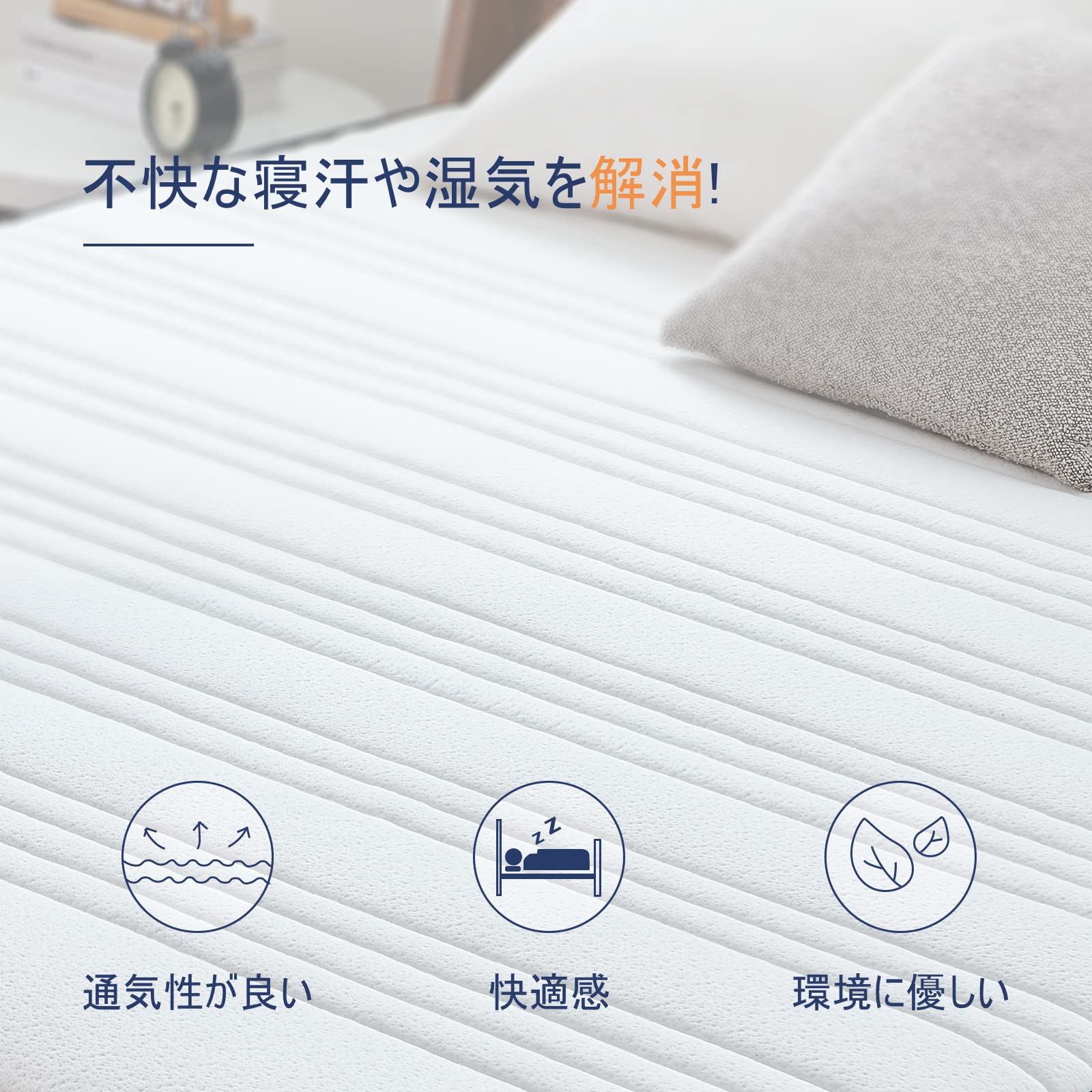 【快適で通気性のある生地】 弊社の気持ちいい生地を使用され、良好な吸湿性能と通気性能がつけます。通気性に優れたタイプを選べば夏場でもむれにくく、暑苦しさを抑えられるので、快適な睡眠が期待できます。さらに新型の材料が柔らかく、密着度も良いてす。良質な睡眠を提供できるエアリーマットレスです。いい眠りを実現し、元気に毎日を迎えられます。また、生地が柔らかく、吸湿通気性があるという特徴があります。