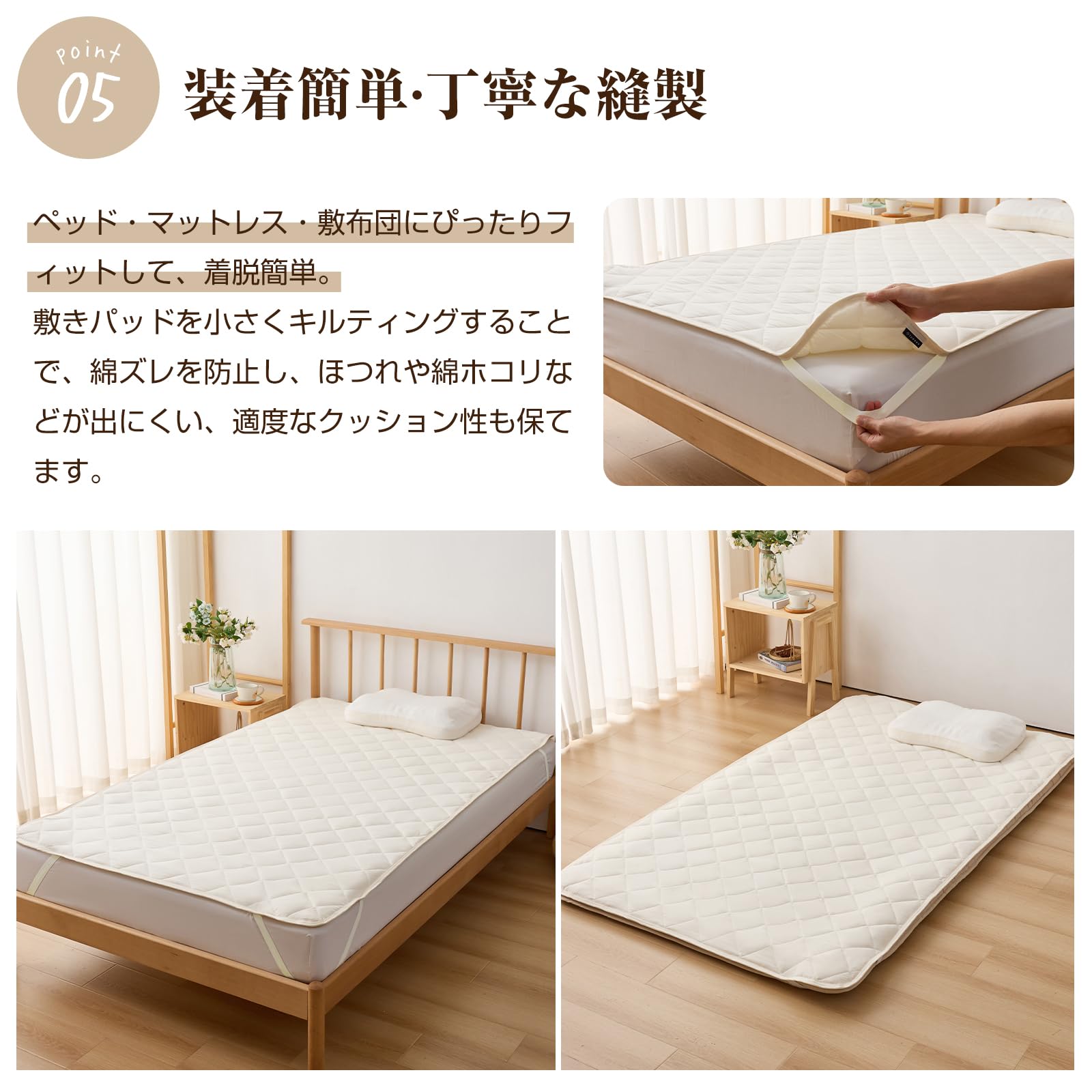 【丁寧な縫製・丸洗いOK】敷きパッドを小さくキルティングすることで、綿ズレを防止し、ほつれや綿ホコリなどが出にくい、適度なクッション性も保てます。生地、中わたともに洗いに強く、乾きの早い素材ですので、ご家庭の洗濯機で手軽に丸洗いが出来ます。何度洗濯しても保温効果が持続しますのでご安心ください。※洗濯する場合は洗濯ネットに入れて洗ってください。