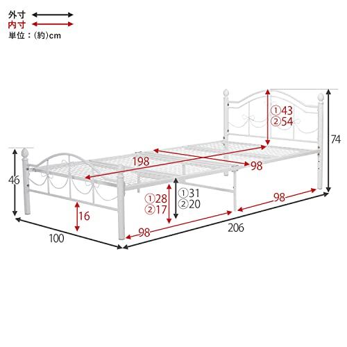 リボンの装飾をヘッド・フットボードにあしらった可愛いベッド。 姫系家具やホワイトインテリアとも相性ぴったりです! 床面の高さは2段階の調節が可能。 薄めのマットレスを使う場合は床面を高めに 厚みのあるマットレスを使う場合は低めに設置できるので、 かわいいヘッドボードが隠れる心配もありません。 床面は通気性のいいメッシュ床タイプ。 ベッド下は収納スペースとして活用できるので 収納場所が少ないひとり暮らしや子供部屋にもおすすめです。 耐荷重は90kgあるので、大人女子からお子様まで幅広い方にご使用いただけます。 【商品サイズ(約)】幅100×奥行206×高さ74×床面高31/20cm 【梱包サイズ(約)】幅101.5×奥行45.5×高さ19.5cm 【梱包重量(約)】22.9kg 【材質】スチール(粉体塗装) 【生産国】中国 【備考】お客様組み立て品(工具付属)