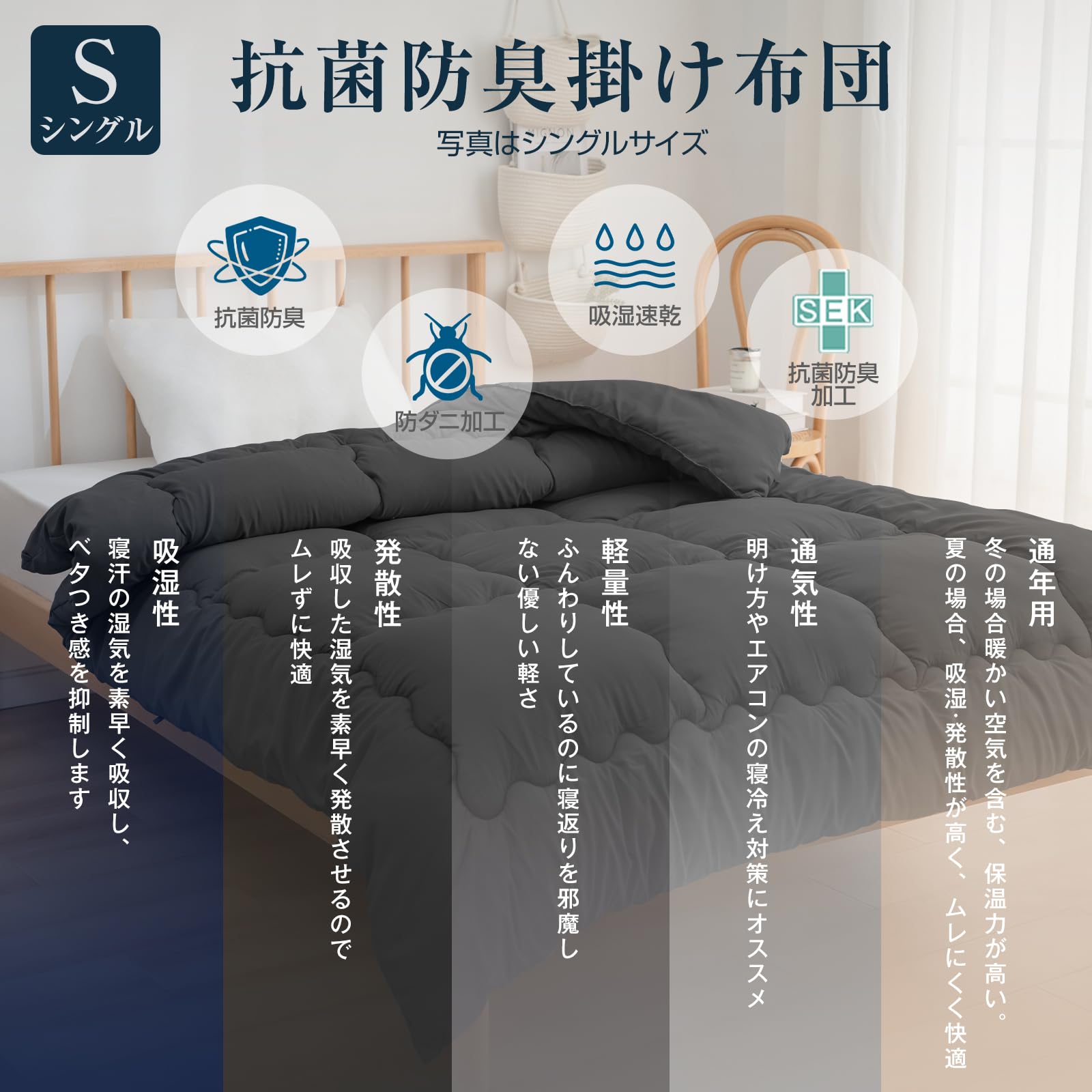【SEK認証 抗菌防臭機能】SEK認証された優れた抗菌防臭加工を施し、繊維上の細菌の増殖を抑え、汗などの嫌な臭いを防いでくれるハイクオリティーな肌掛け布団です。いつまでも生地を清潔に保ちできます。通気性もアップし快適な寝心地を感じられます。
