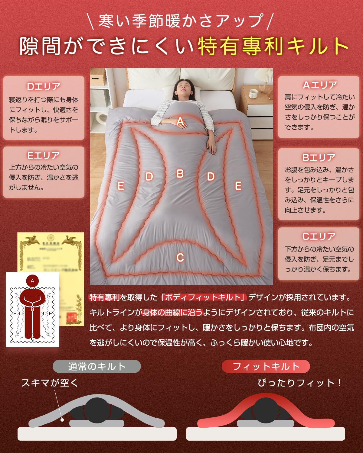 【体にフィットする・特有專利取得キルト】人間工学に基づいた特有專利取得の「ボディフィットキルト」と曲線キルト縫製により、布団との隙間が少なく、身体、首元、肩口にぴったりフィットして暖かい空気を逃がしません。