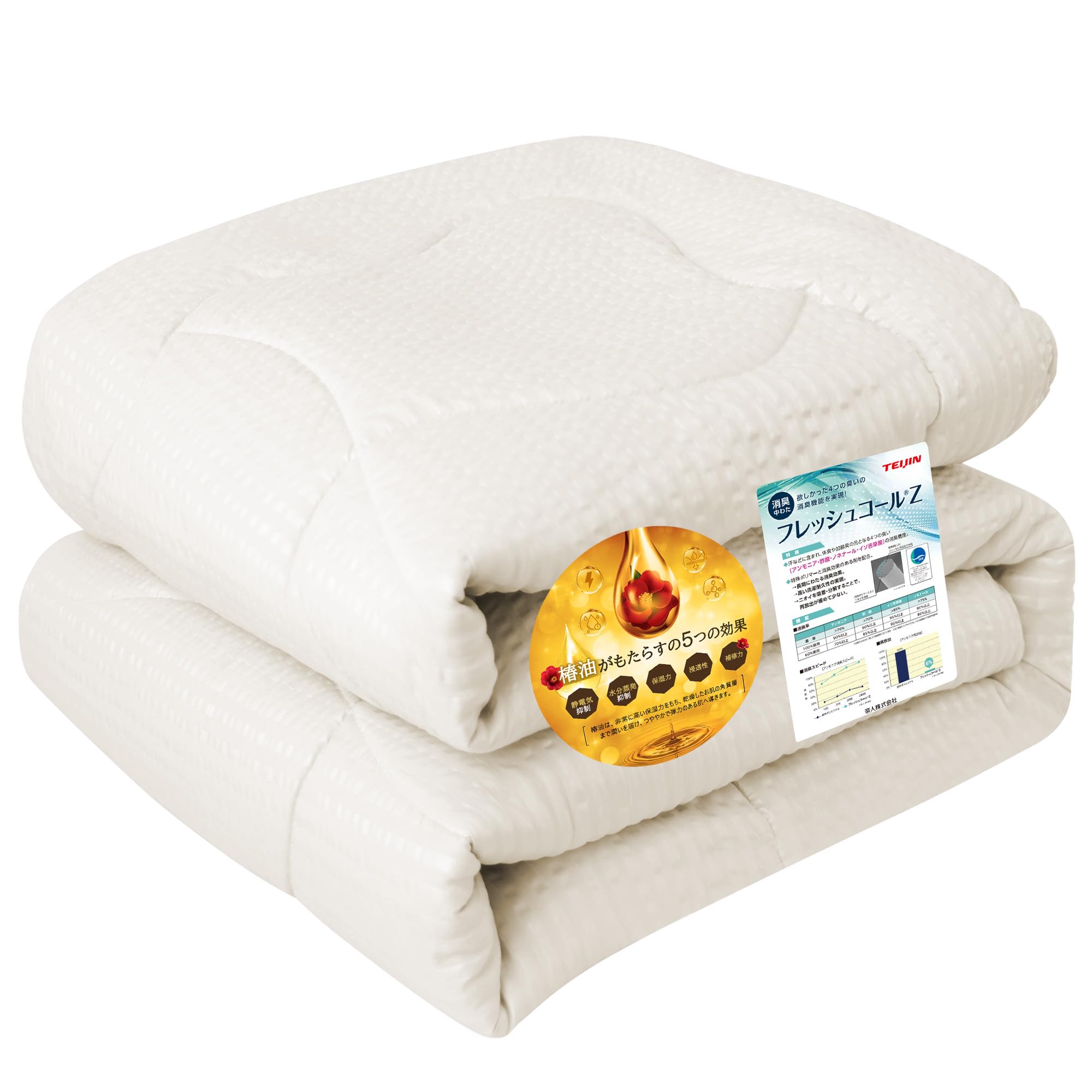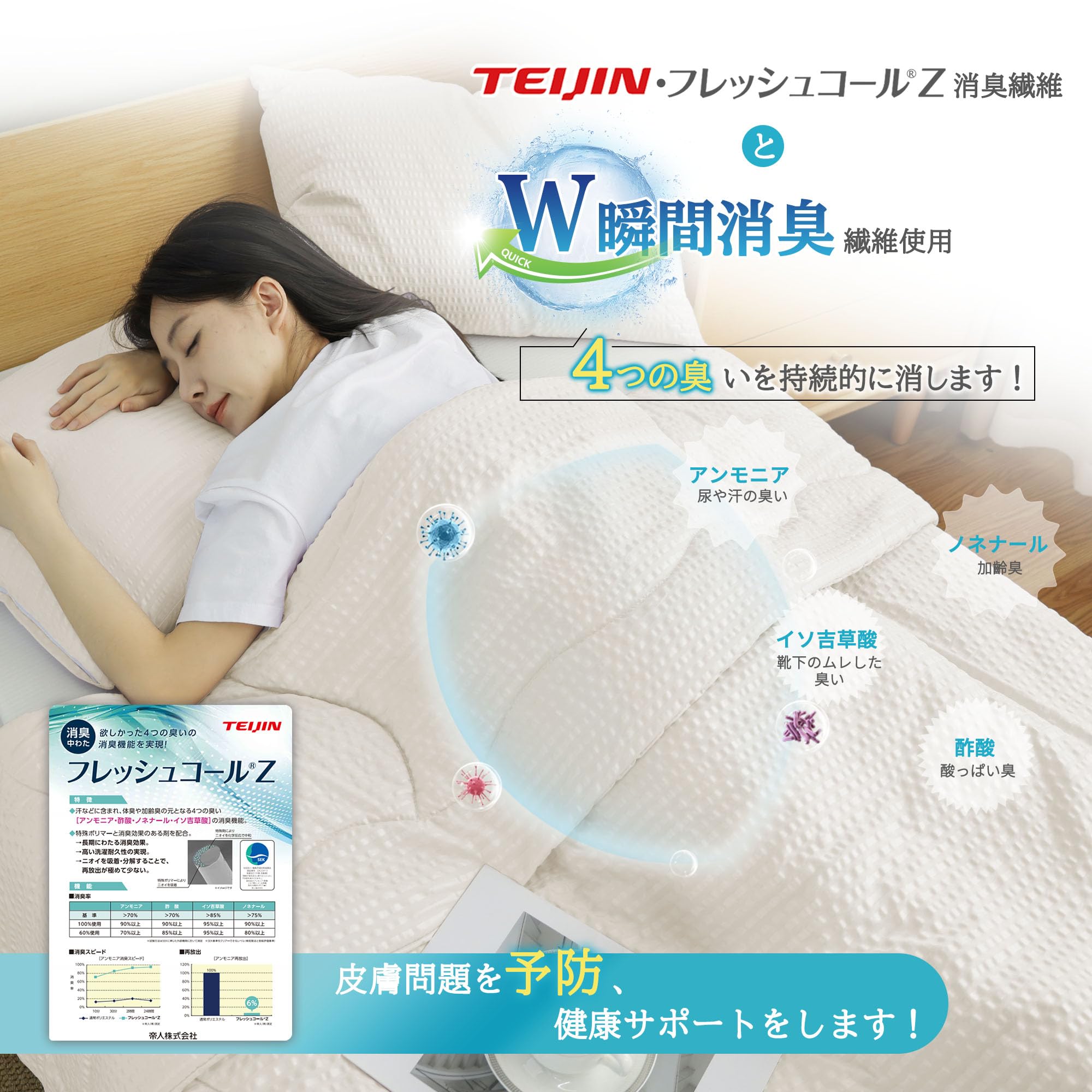 【TEIJIN・フレッシュコールZ・消臭】掛け布団は『帝人フレッシュコールZ』中わたを使用、「フレッシュコールZ」は、ポリエステル短繊維 中わた用機能素材です。アンモニア、酢酸、イソ吉草酸、ノネナールといった4大悪臭(汗などに含まれ、体臭や加齢臭の元となる4つの臭い)に対して高い消臭機能を発揮します。また、機能剤による後加工では無く原綿に機能剤を練り込んでいるため、機能耐久性にも優れます。