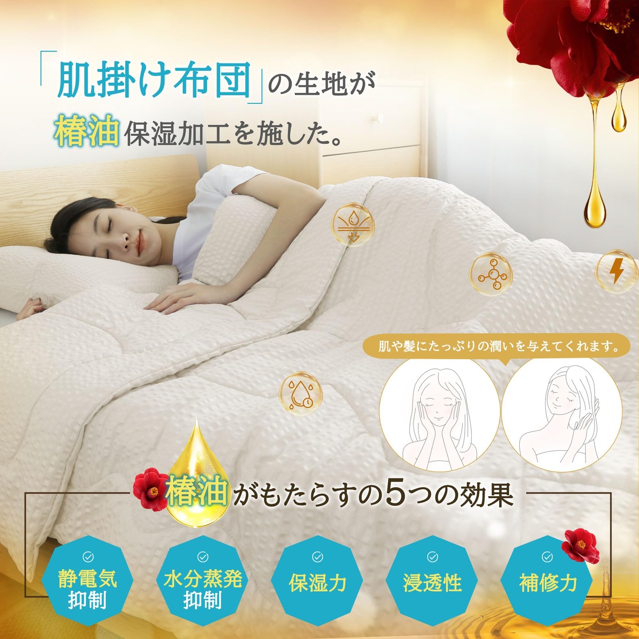 【椿油保湿・優しい肌触り】椿油は、非常に高い保湿力をもち、乾燥したお肌の角質層まで潤いを届け、つややかで弾力のある肌へ導きます。掛け布団の生地が椿油保湿加工を施したため、優れた高保湿、防静電、皮膚再生保護の効果があります。やわらかな風合いとなめらかな肌ざわりが最高です!肌への刺激が少なく、肌が弱い人や子供にも使いやすい素材です。