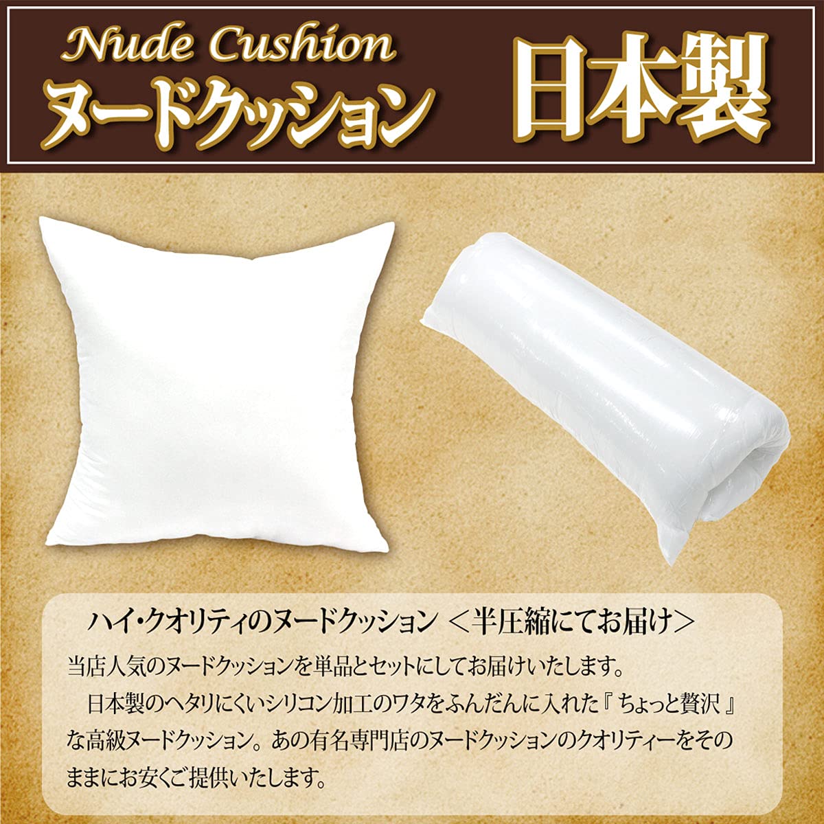 ハイ・クオリティのヌードクッション。日本製のヘタリにくいシリコン加工のワタをふんだんに入れた『ちょっと贅沢』な高級ヌードクッション。注文をいただいてから中身を詰めますので、よりフワフワな感触をお楽しみいただけます。他店のヌードクッションに比べてガワサイズを大きめにしておりますので、カバーの端までワタが詰まるようにしています。