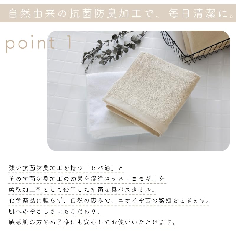 【嫌な匂いを軽減!抗菌防臭加工】東北地方のヒバから採れるヒバ油には、強い抗菌・防臭加工を持つ成分が含まれています。この貴重な成分を使用してタオルに加工しました。更に効果を促進するヨモギを柔軟加工材に配合しています。自然の恵みを利用したタオルは、人と環境に安全な抗菌防臭タオルです。
