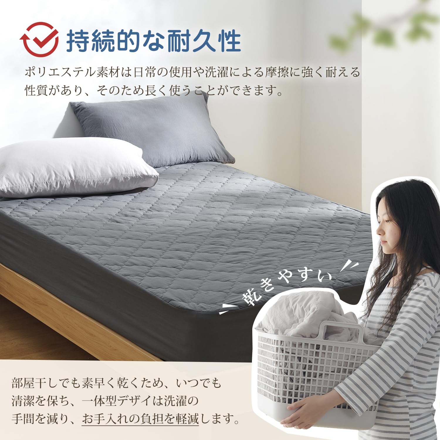 「通気性と速乾性」:通気性が高いため、シーツの中で湿気がこもりにくく、快適な寝心地を提供してくれます。また、このシーツは中綿が入っているにも関わらず、速乾性に優れています。洗濯後に素早く乾くため、いつも清潔な寝場所を保ちます。