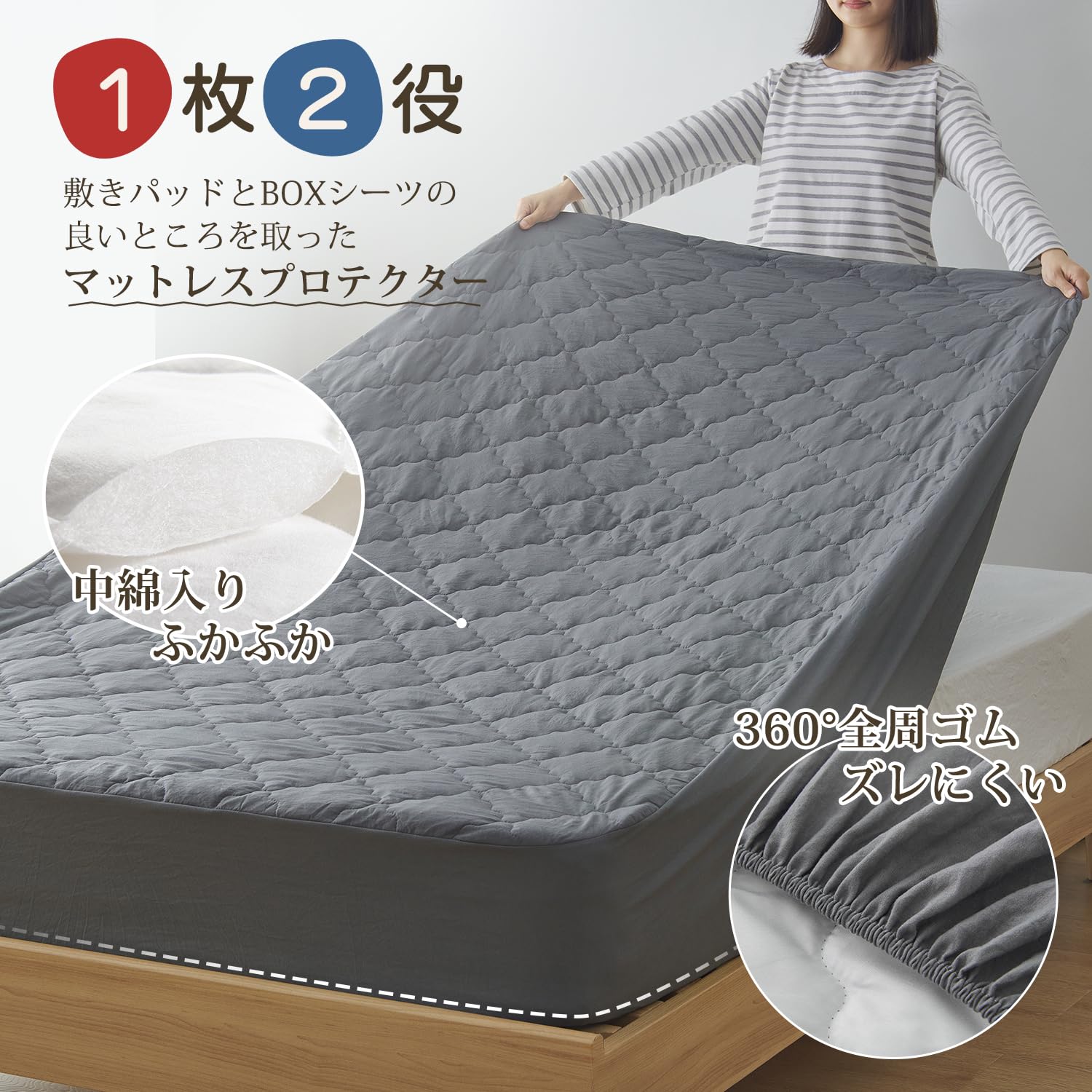 「一体型デザインでお手入れ簡単」:ベッドパッドとボックスシーツが合体しており、お手入れが簡単で、見た目もスッキリしています。裏面は全周ゴム仕様になっているので、寝返りしてもズレにくいです。これ一枚でベッドメイキングが完了し、洗濯物も減らせるため、家事の手間を省くことができます。