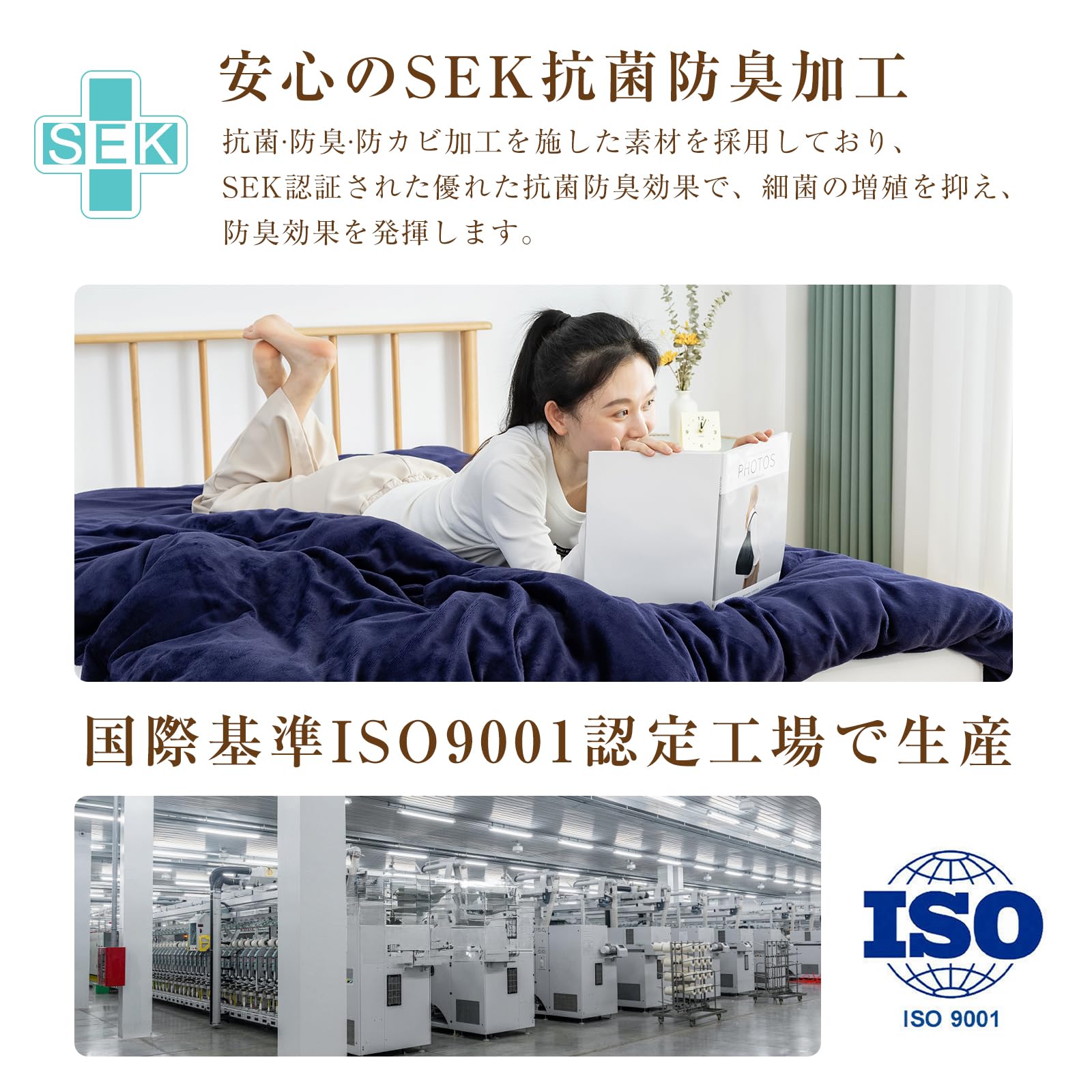 【抗菌防臭加工・SEKマーク取得】側生地には抗菌防臭・防ダニ加工が施されており、発汗や皮脂の付着によるイヤな臭いの発生を防ぎ、清潔な使用感が続きます。抗菌防臭効果には、SEKマークを取得し、清潔さにご安心できます。