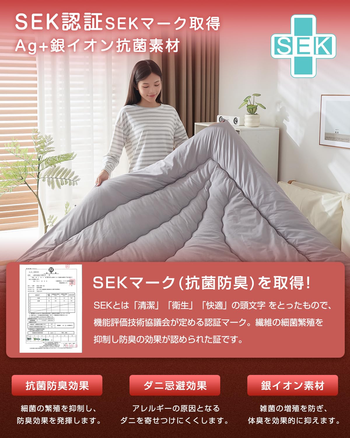 【SEK認証・Ag+銀イオン抗菌素材】抗菌防臭・防ダニ加工で細菌やダニの増殖を防ぎ、お子様やアレルギー体質の方にも安心してお使いいただけます。さらに、銀イオンも雑菌の増殖を防ぎ、嫌なにおいを抑制します。