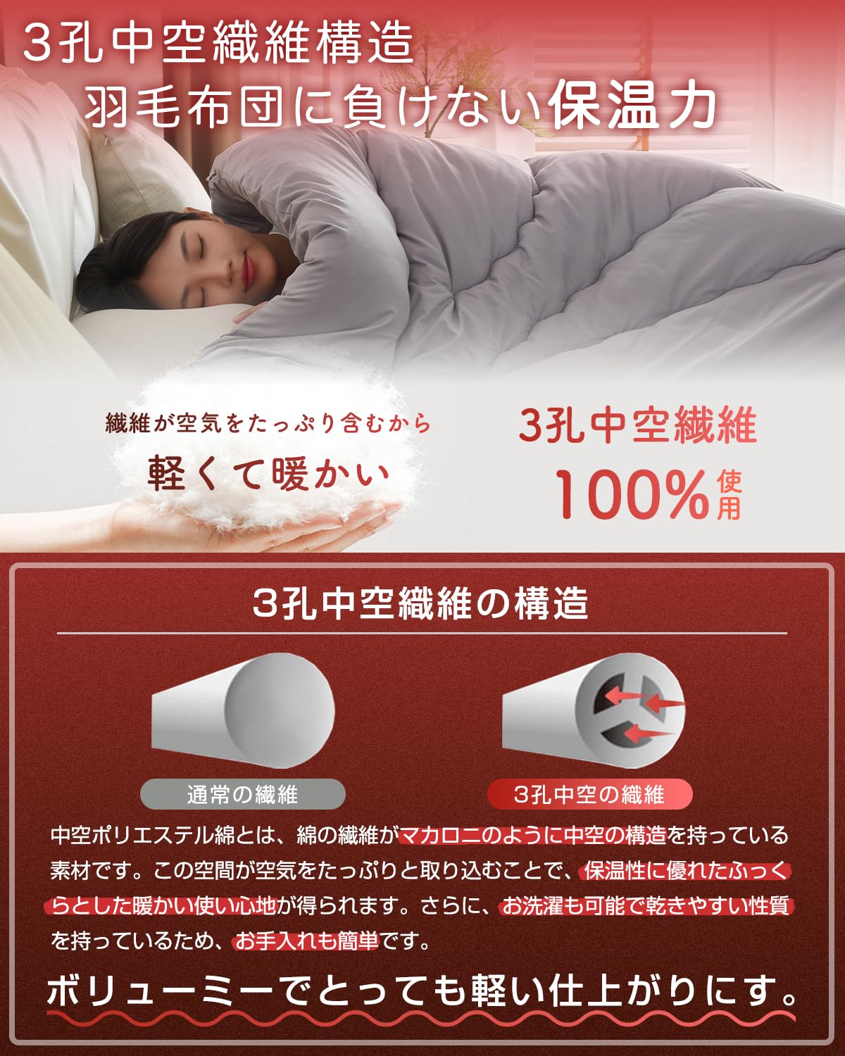 【3孔中空織維構造・軽くて暖かい】3孔中空織維構造のふんわりとした中綿が、程よい厚みでたっぷりと空気を含み、「ちょうどいい暖かさ」をキープします。軽くてほんのりと暖かく、それでいて高い吸湿・通気性のおかげで、お布団の中は蒸れずにとても快適です。