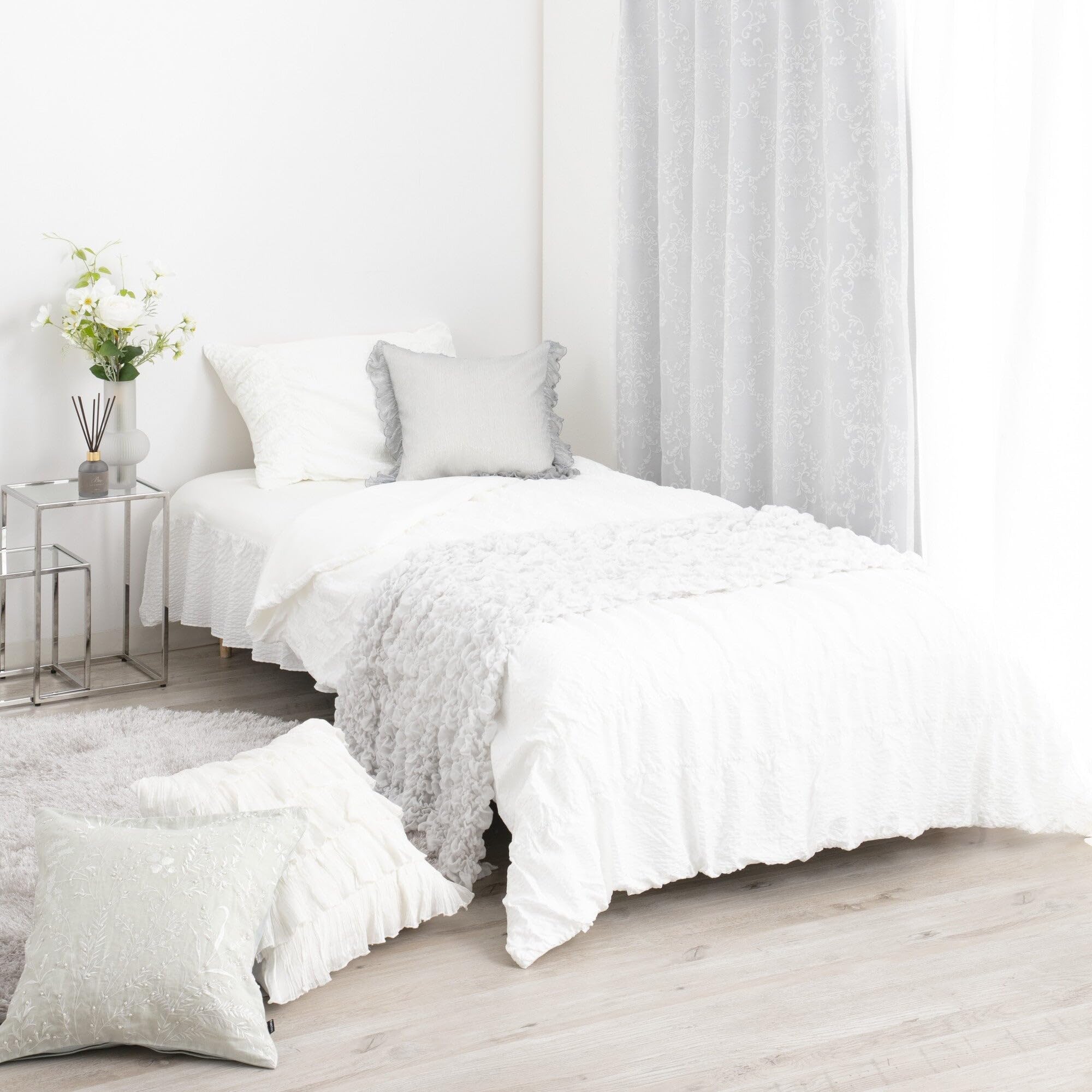 シャリ感と凹凸の生地が夏らしく涼やかで爽やかなベッドコーディネートを叶えてくれます。ギャザー部分にはシャリ感のある凹凸加工を施した生地を使用し、肌に触れる部分には滑らかな肌触りの天竺素材を使用しているので、春夏にぴったりの気持ちの良い肌触りをお楽しみいただけます。