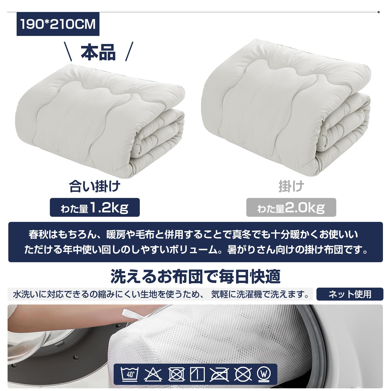 【 丸洗いOK】ご家庭でのお洗濯可能(洗濯機で丸洗い、手洗いできる)。ポリエステル生地とポリエステル綿を使っているので、一般的な綿を使った肌掛け布団に比べると乾きが早く※洗濯する場合は洗濯ネットに入れて洗ってください。