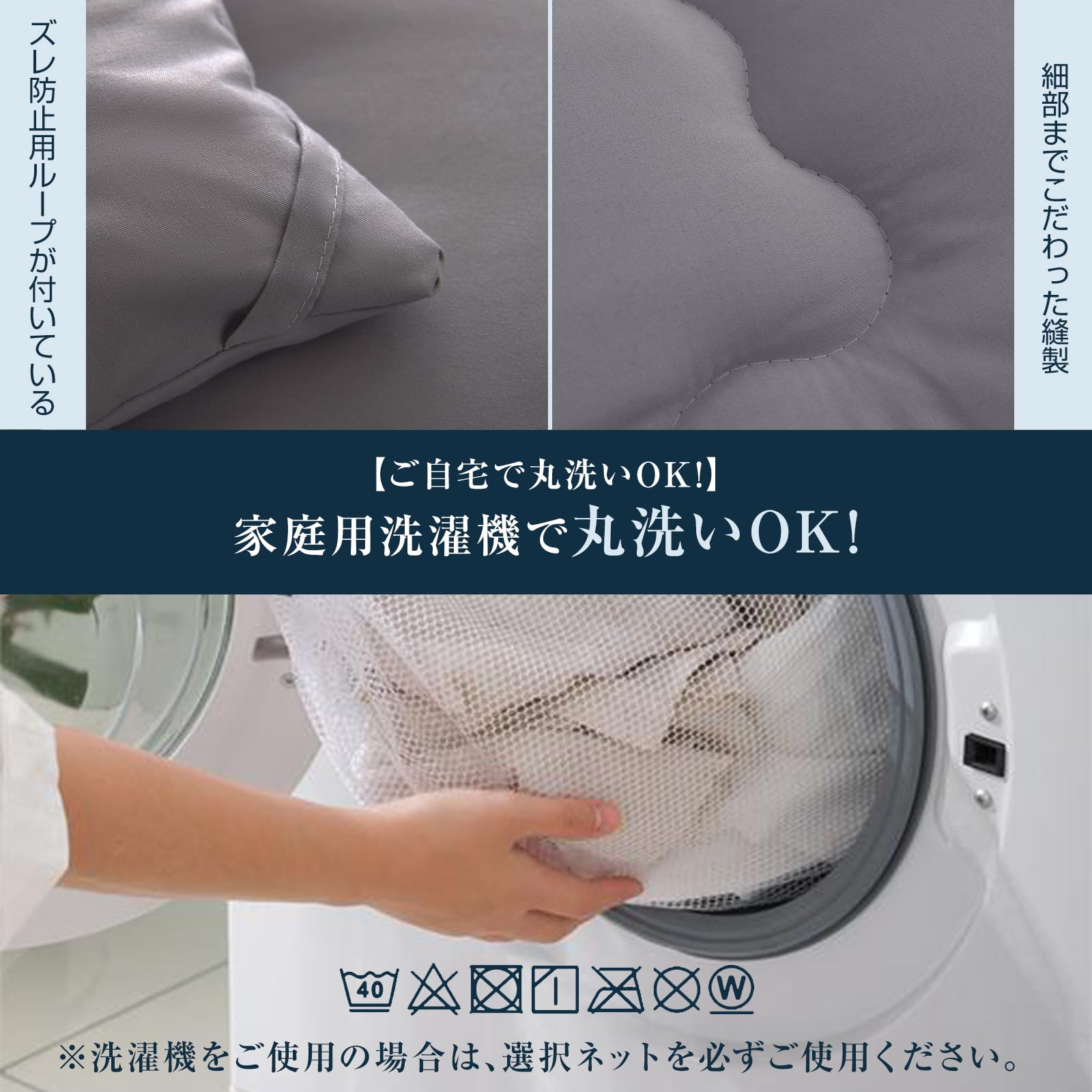【洗える 布団】洗濯機をご利用の場合は、洗濯機の容量や説明を確認し、洗濯ネットに入れて手洗いコースで洗ってください。ご家庭でお洗濯できるので清潔にお使いいただけます。お洗濯しても中身のわたが片寄りにくく、快適にお使いいただけます。