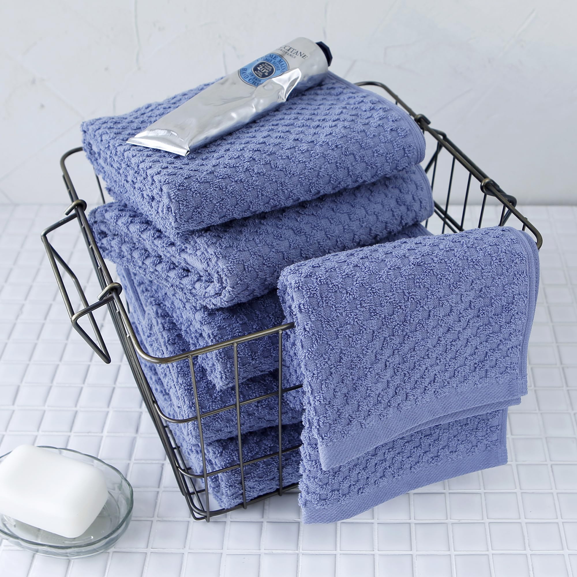 【AMYオリジナル商品 サマルカンタオル】 「新しい紡績技術」×「ドビー織」 この2つを掛け合わせて作りました。 わずらわしい毛羽落ちが劇的に少ないのが魅力です。 表面の凸凹が空気をたくさん含んで、肌触りがとても優しいタオルです。 カラーバリエーションは全部で9色あります。 場所や用途で色分けしたり、使う人によって色分けしたりできるので、衛生的に安心してお使いいただけます。 お気に入りの色を見つけてみてください